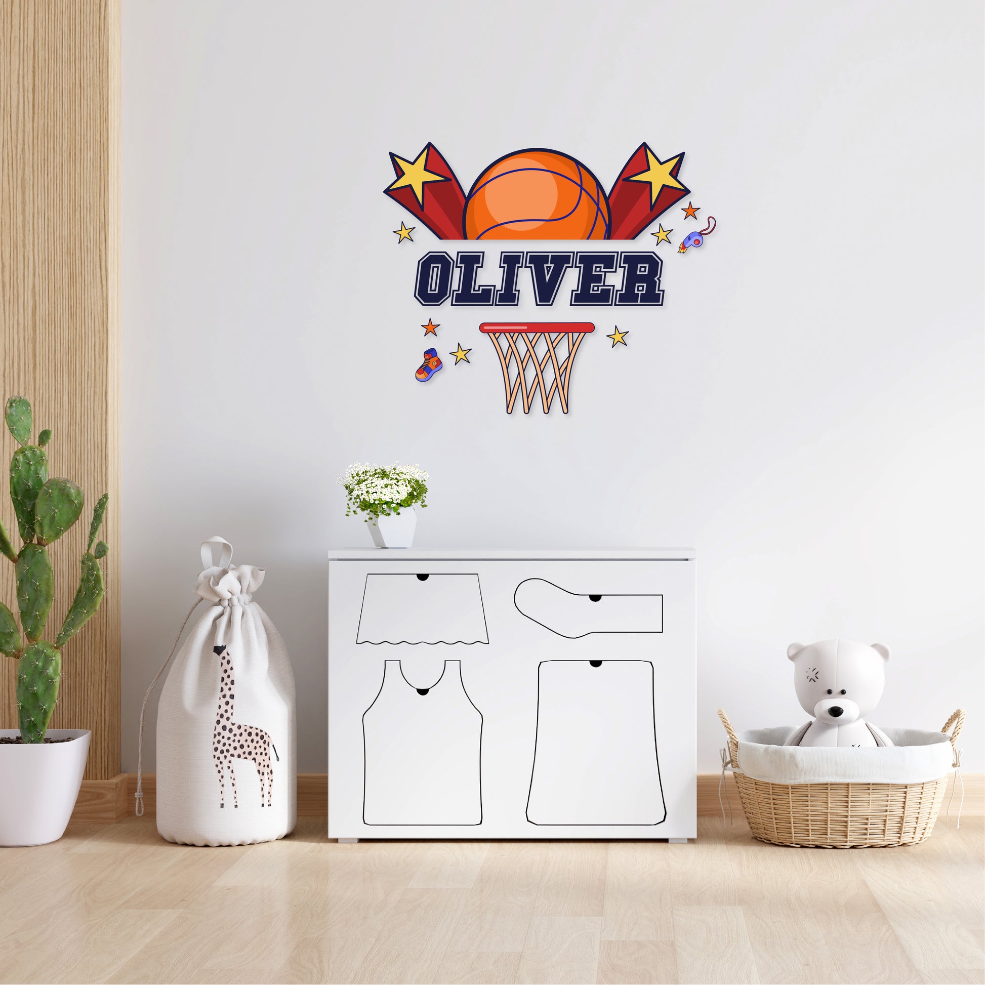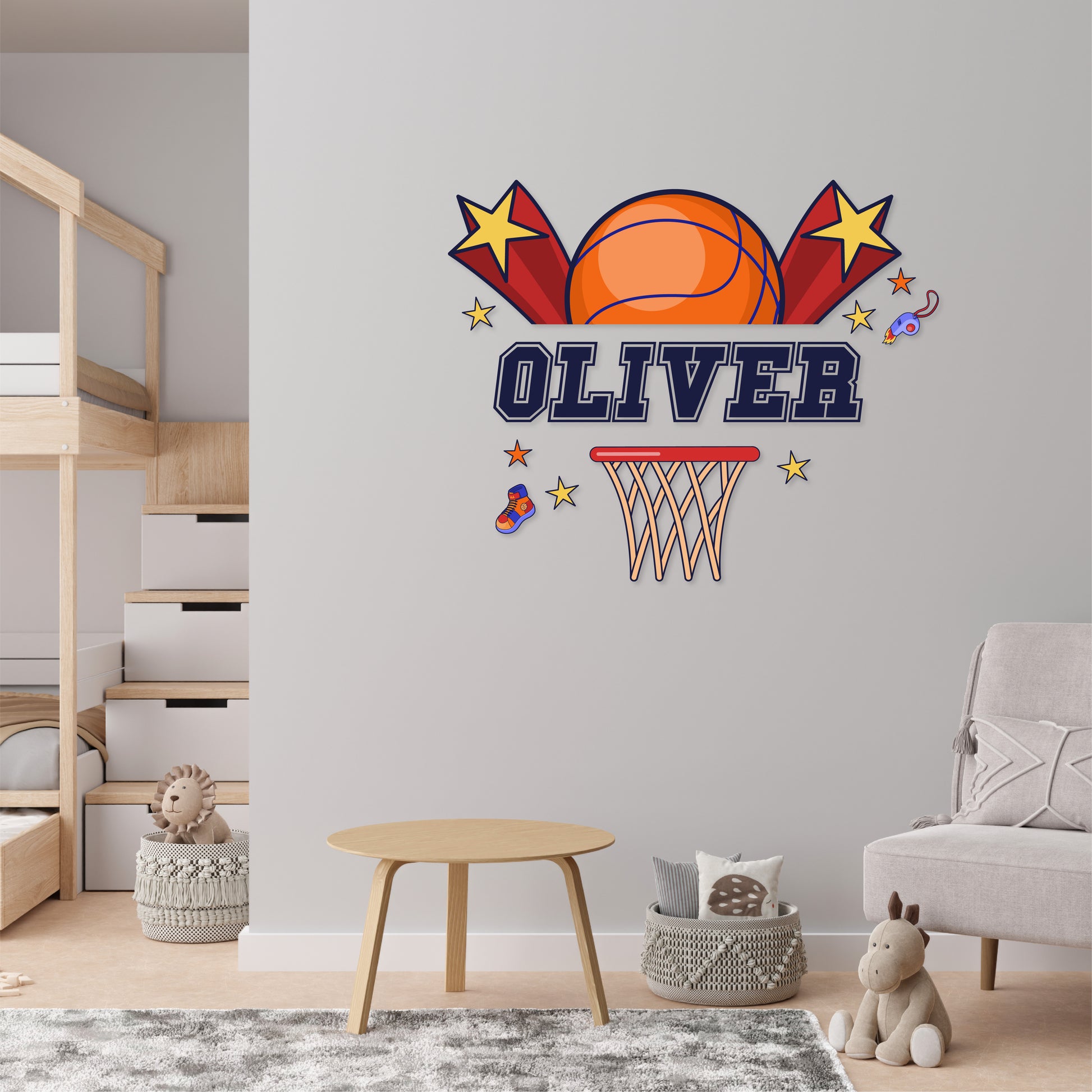 Shoot for the stars with our 'Custom Name Basketball Slam' wall decal collection. Your name is featured alongside basketball essentials like a ball, hoop, sneakers, whistle, and stars. Personalize your space with this dynamic design and celebrate the love of basketball in style.