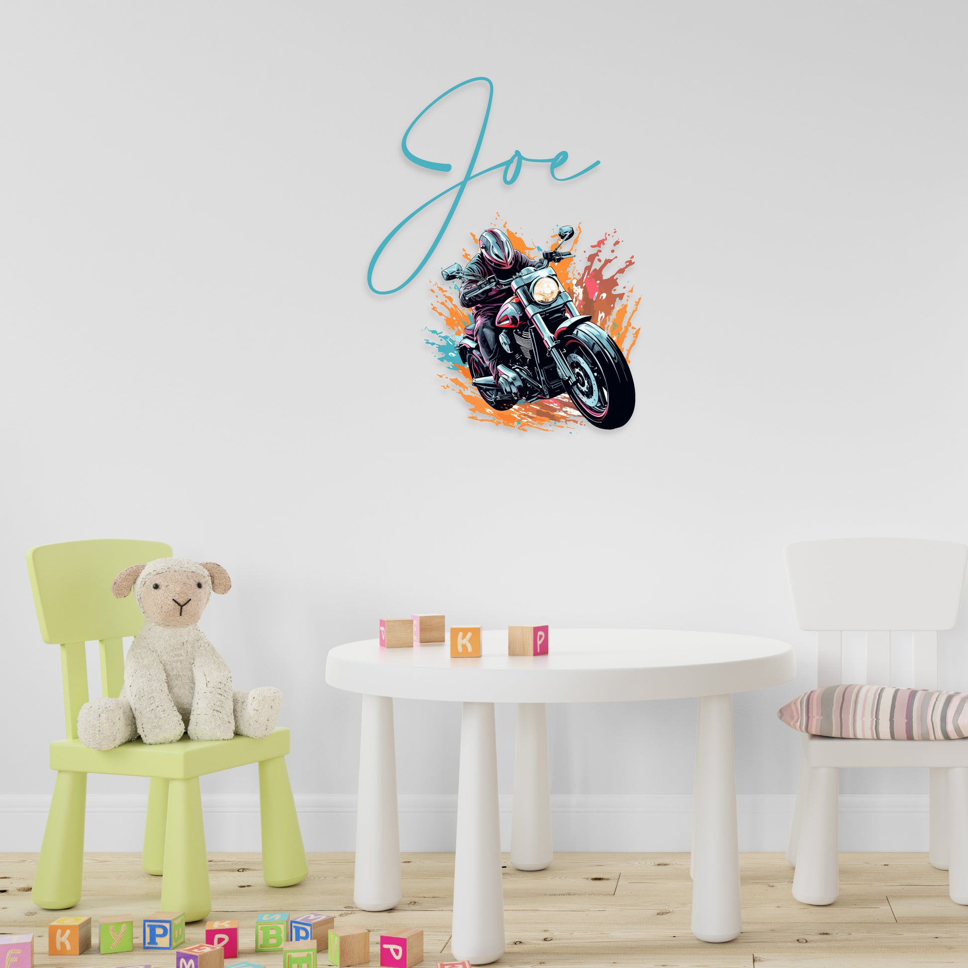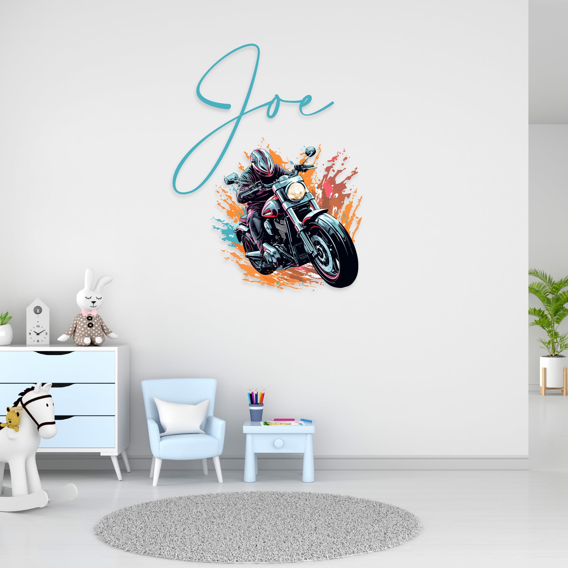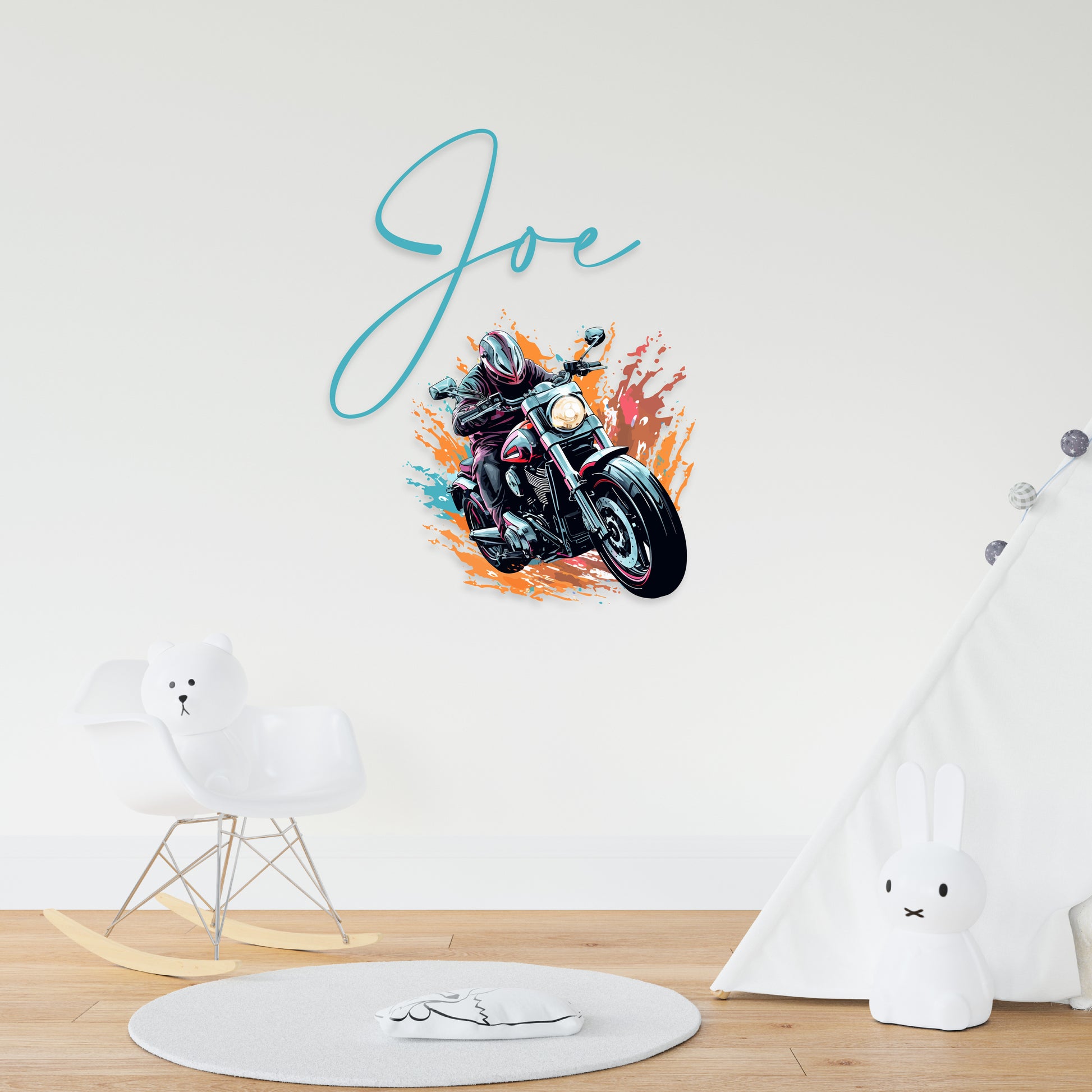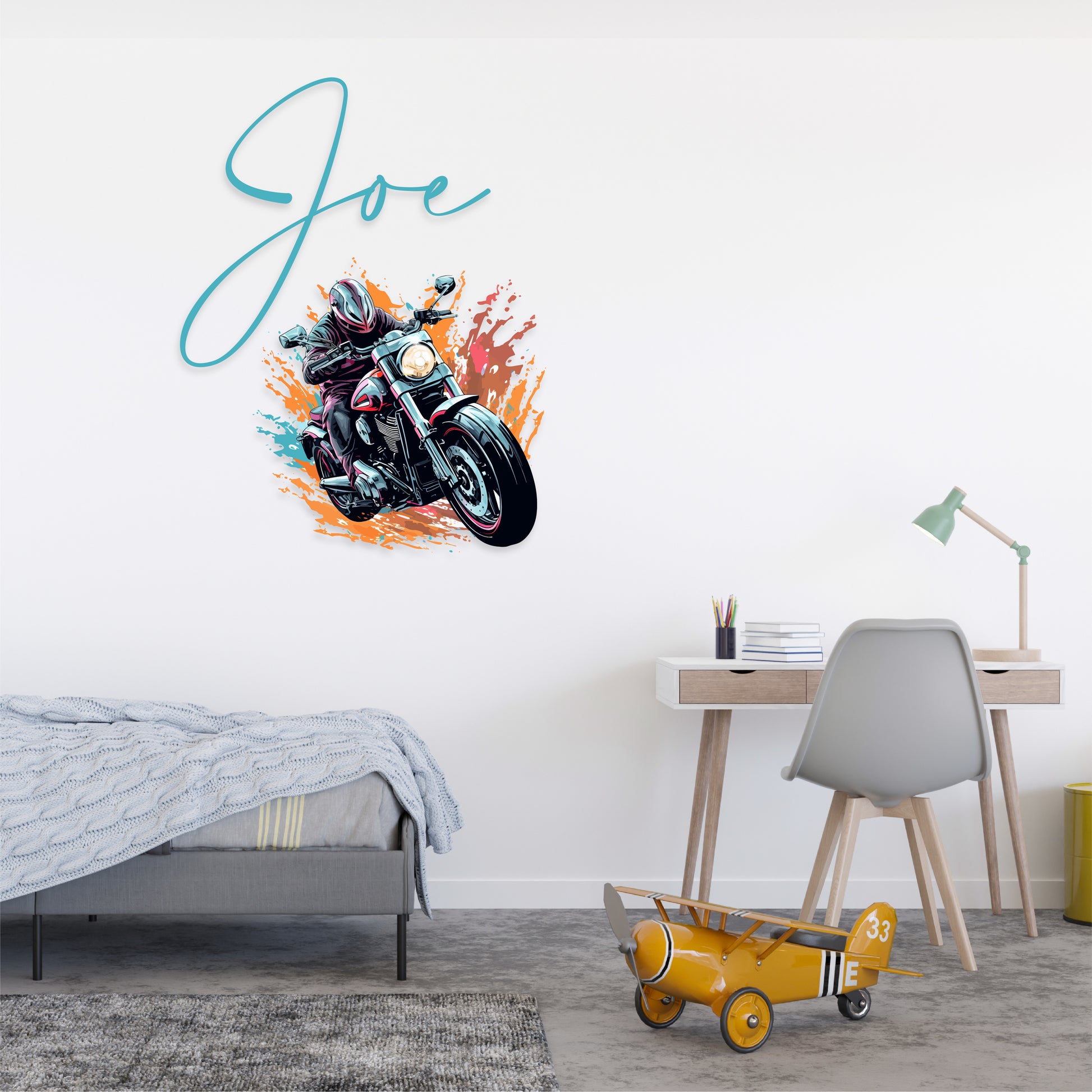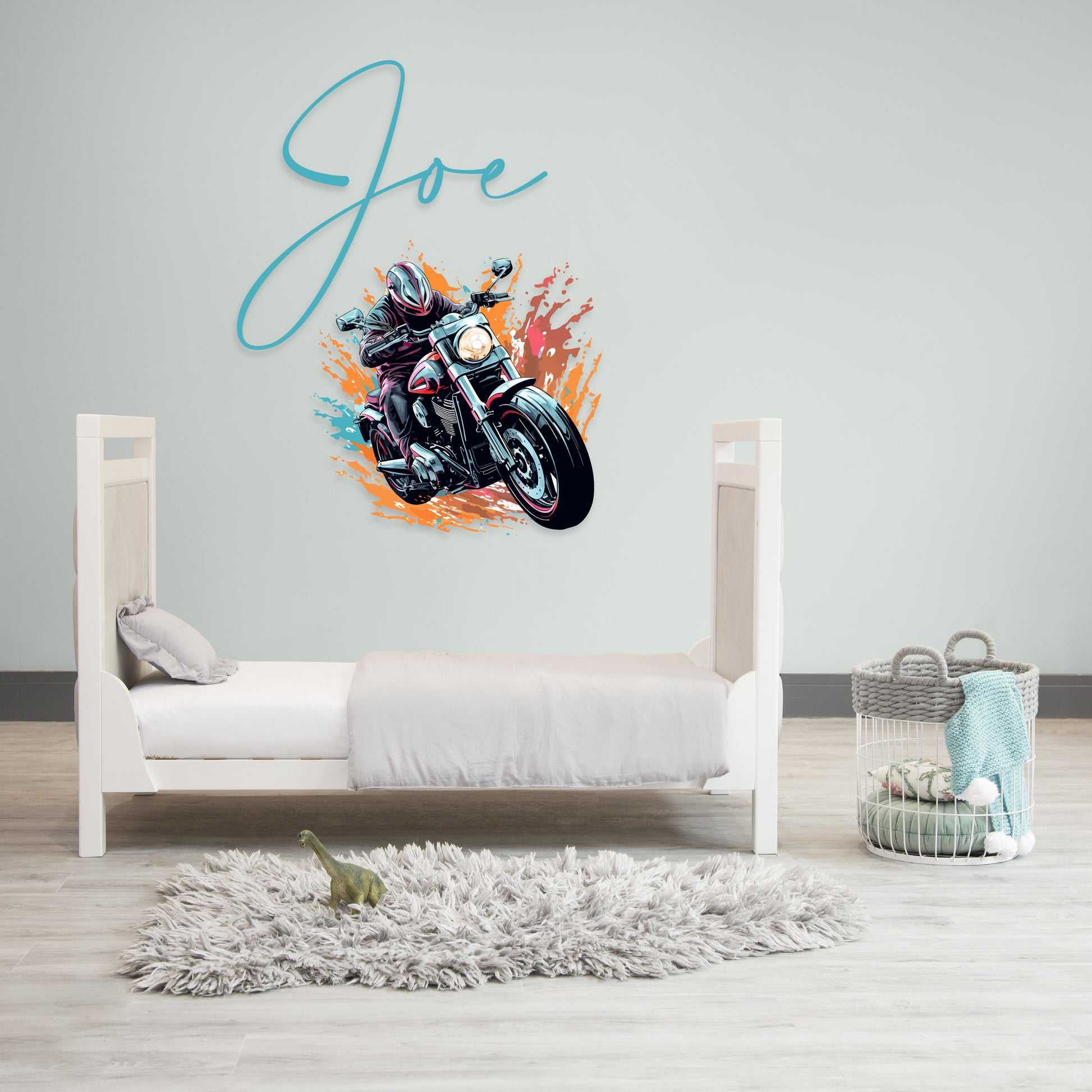 Feel the thrill of the open road with our 'Custom Name Motorcycle Splash' wall decal collection. Your name is featured alongside a motorcyclist against a backdrop of vibrant paint splashes. Personalize your space with this energetic design and let the motorcycle splash bring excitement indoors.