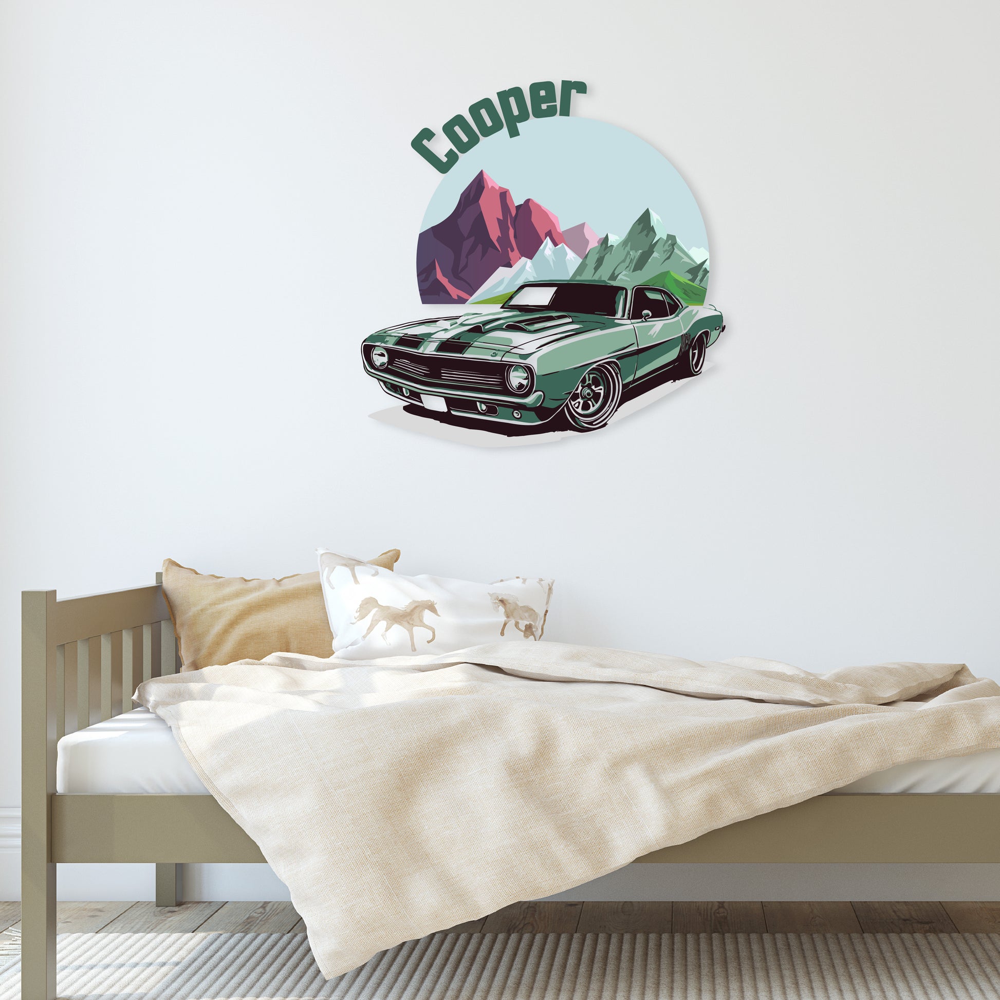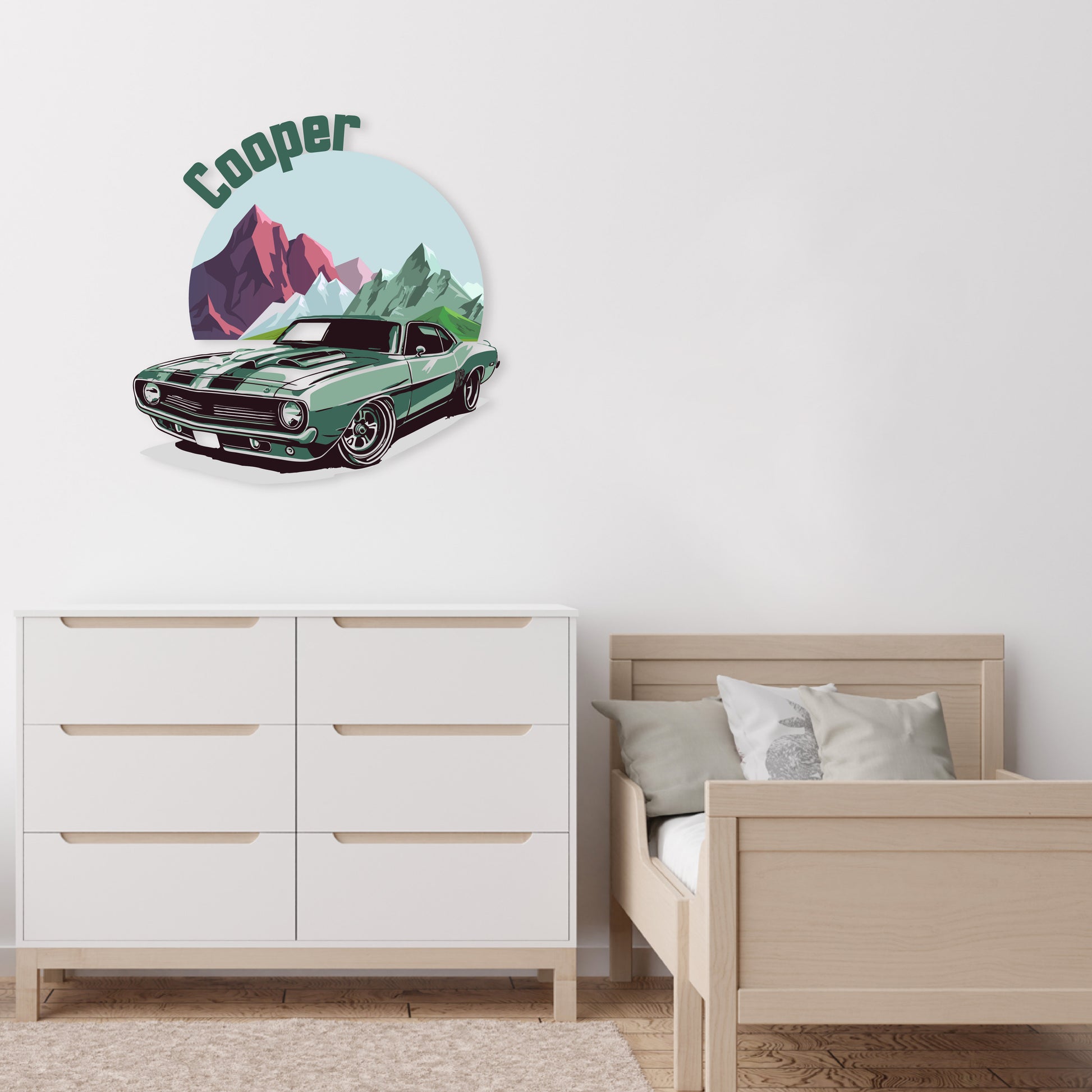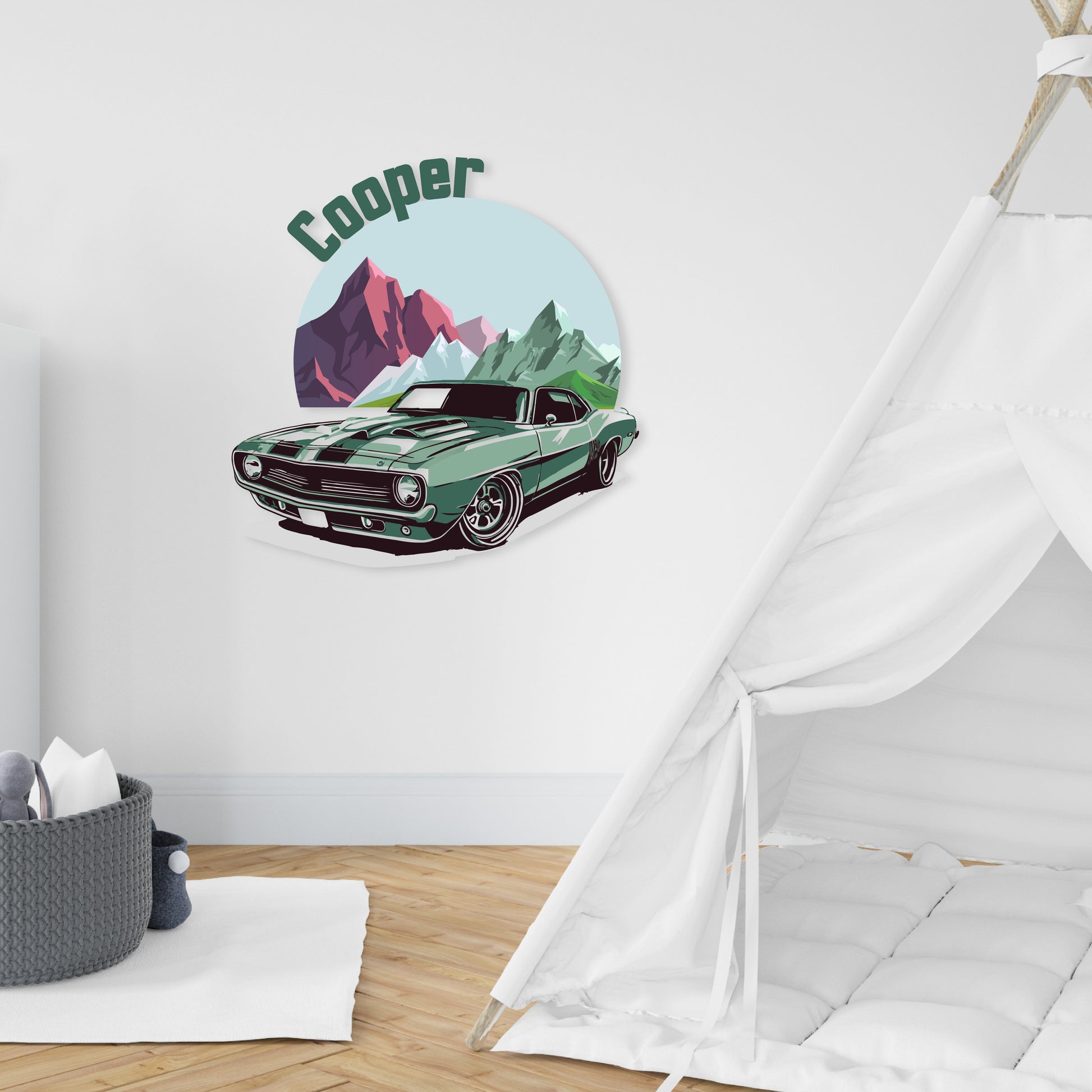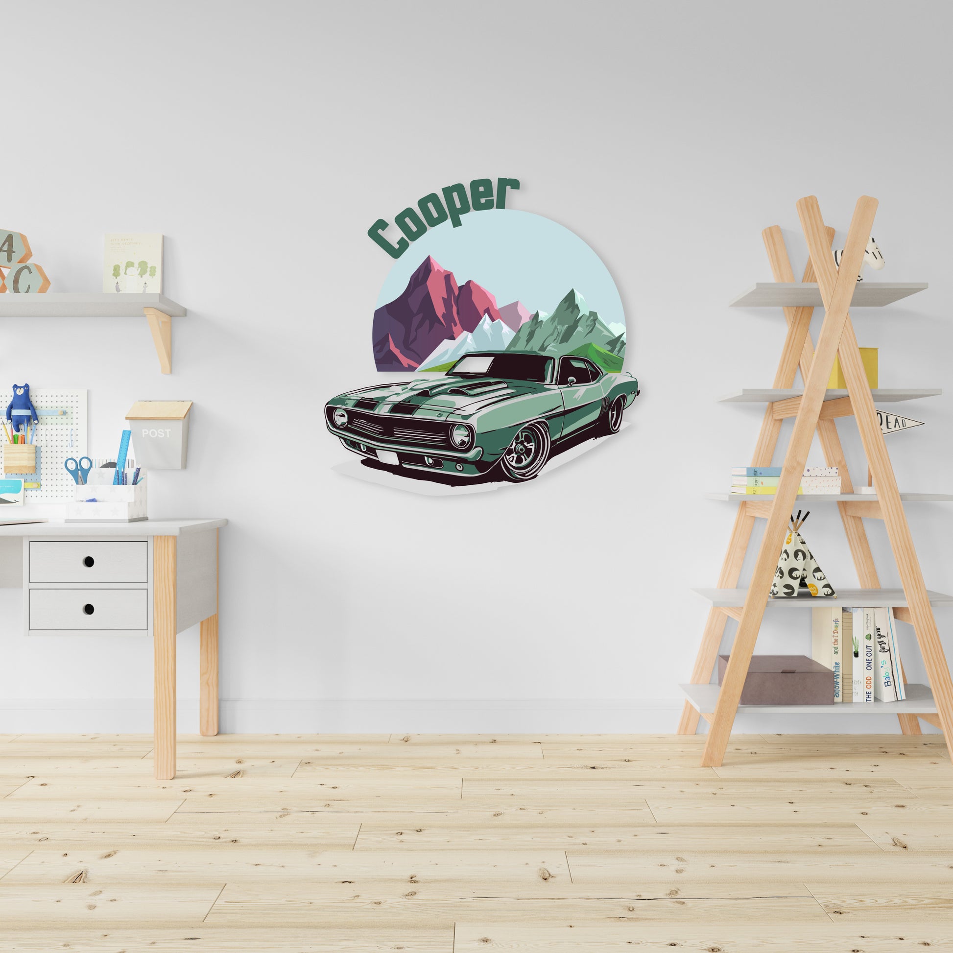 Custom Wall Decals - Custom Name Mountain Adventure Wall Decal: Green Car with Mountains in the Background
