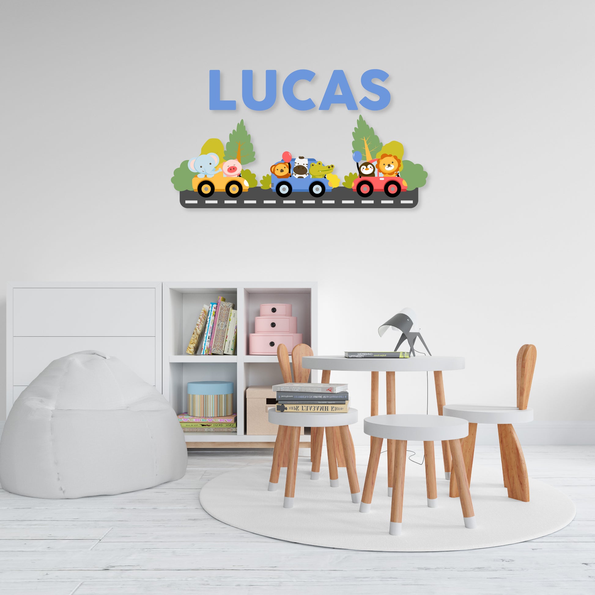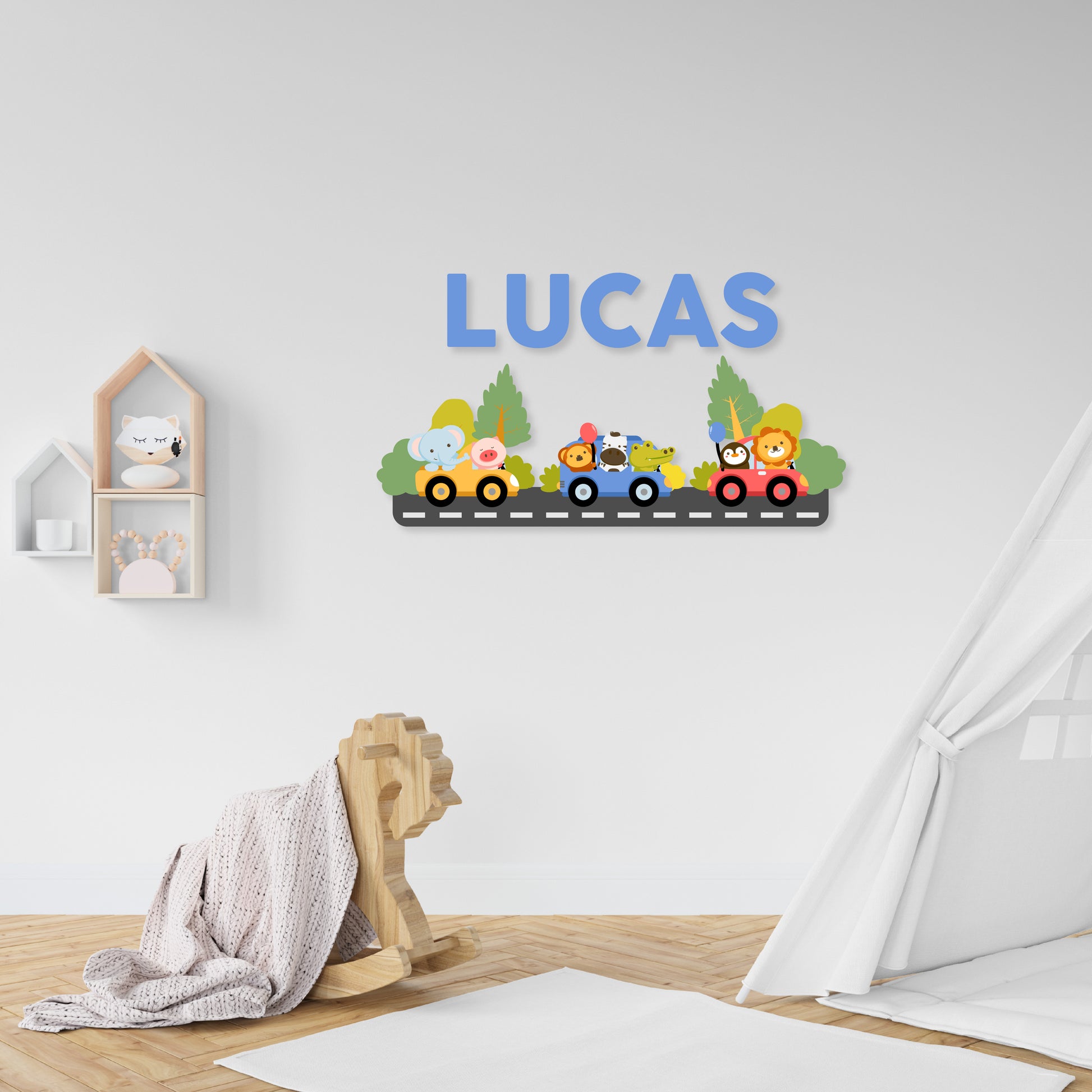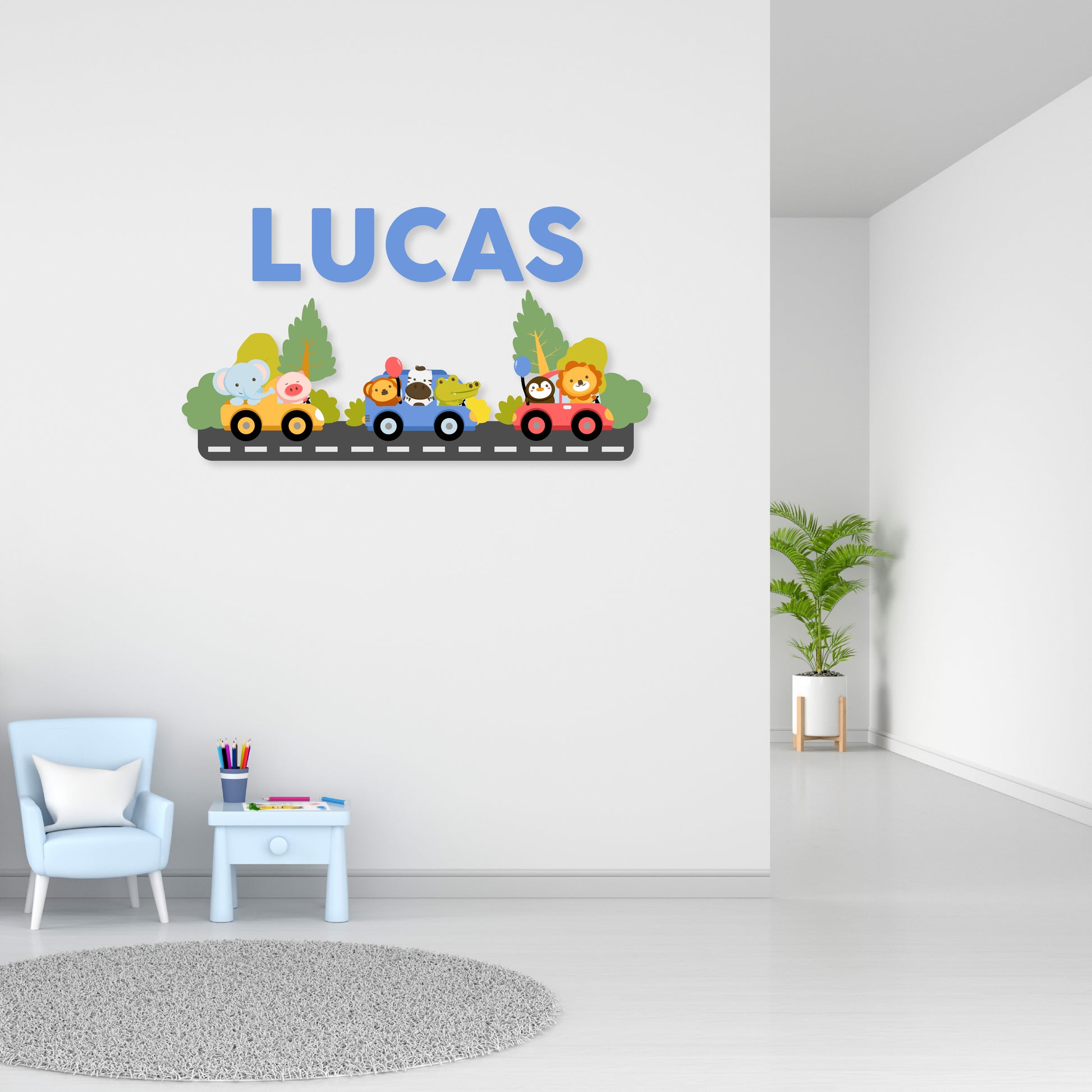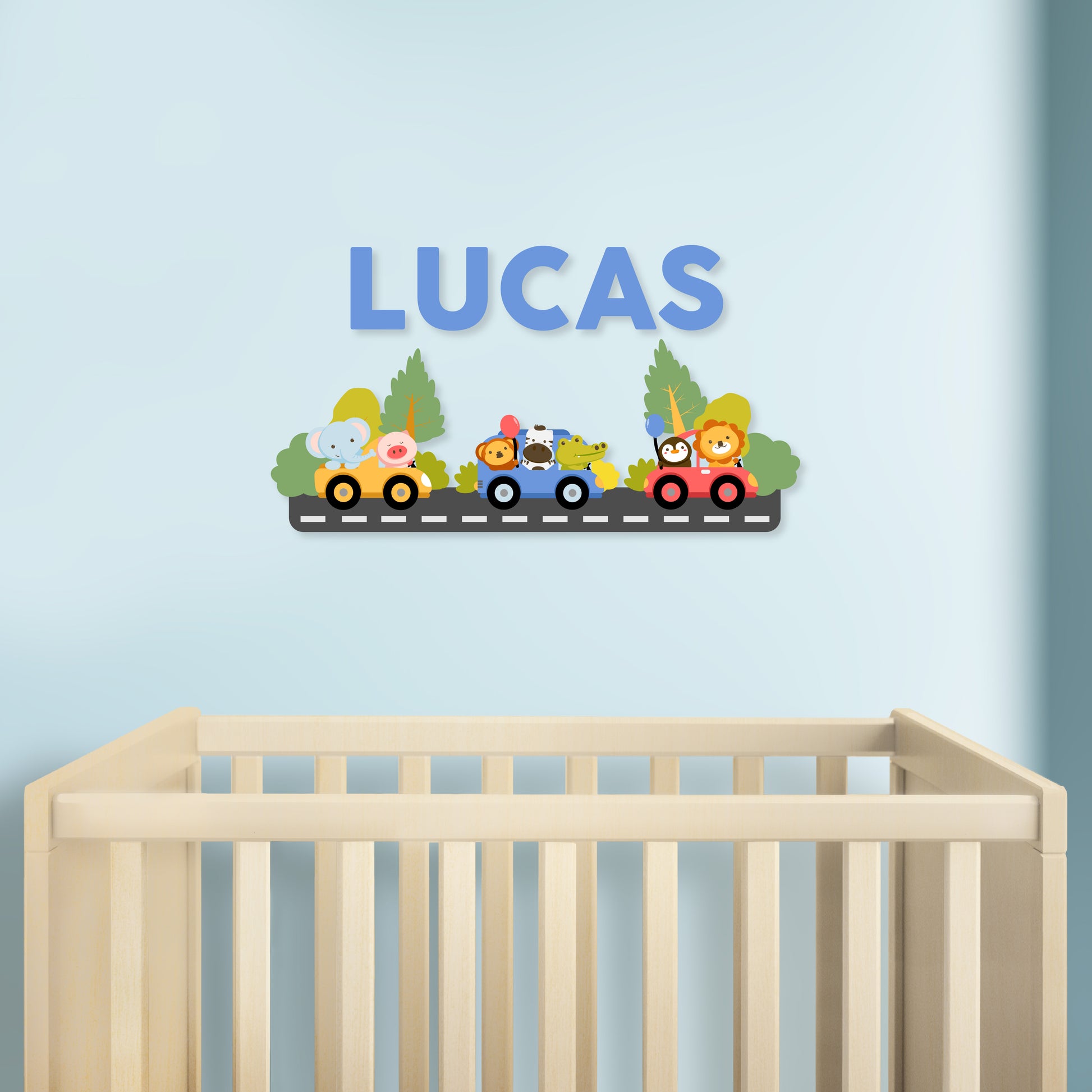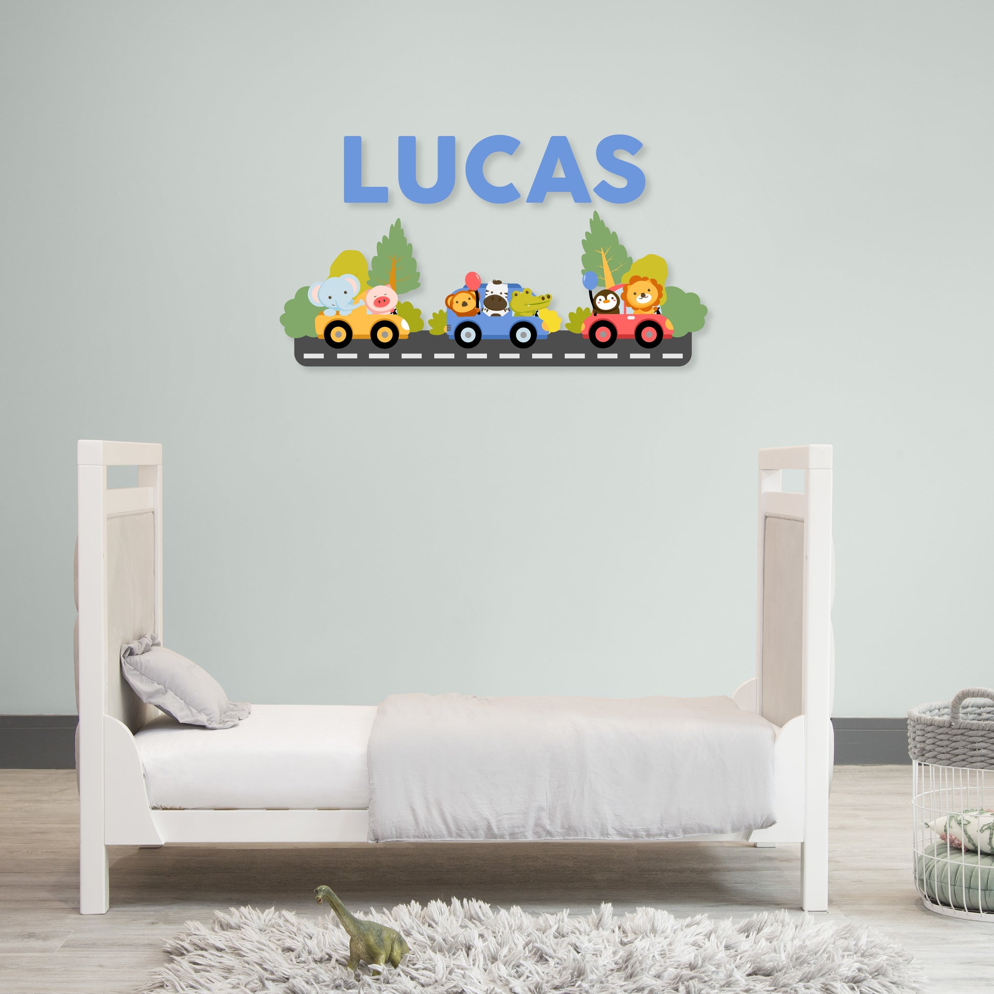 Custom Wall Decals - Custom Name Multicolored Animal Caravan Wall Decal: Animals in Colorful Cars (Yellow, Blue, Red)