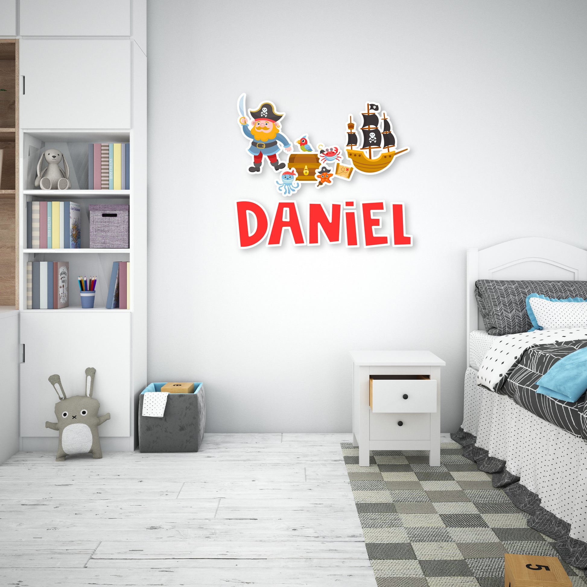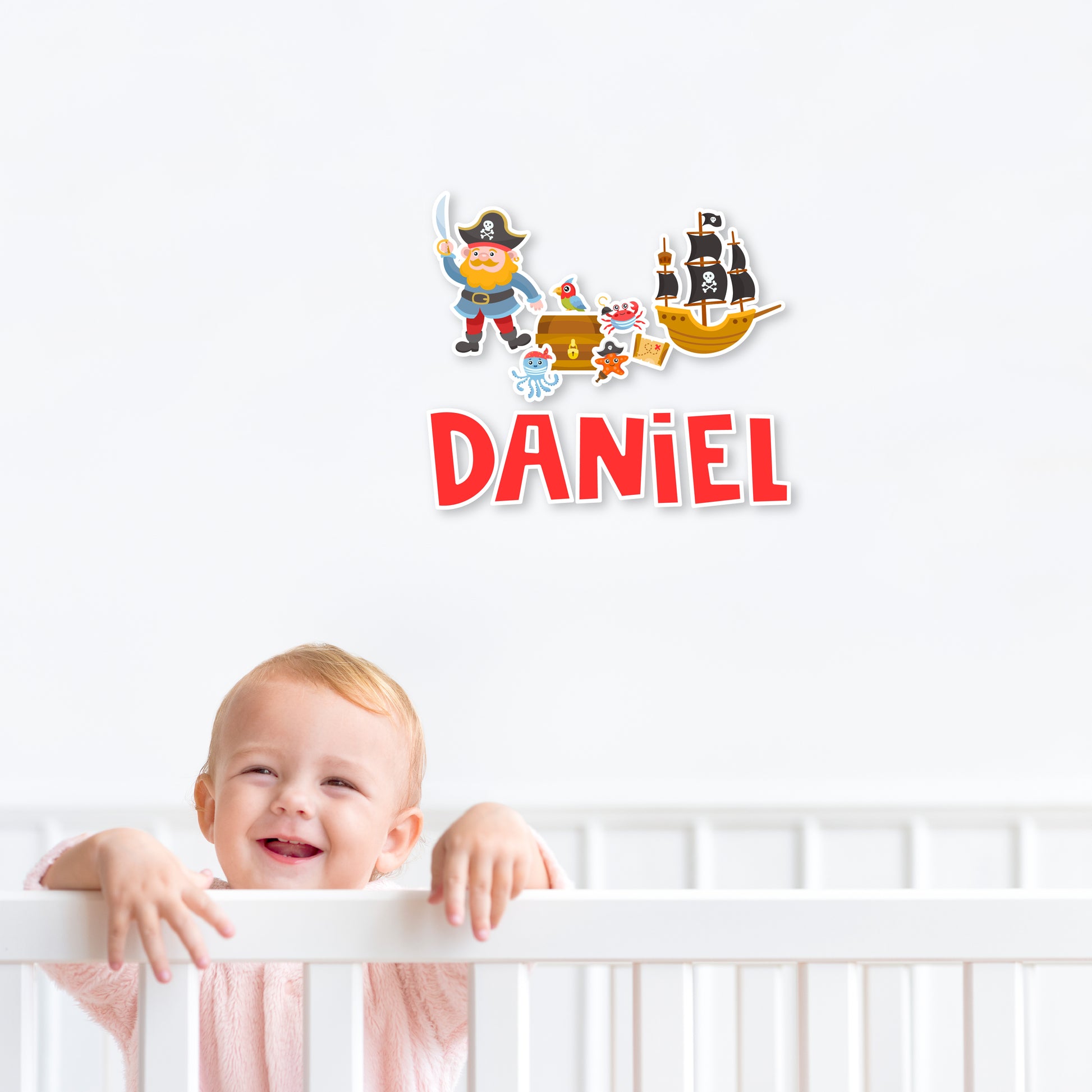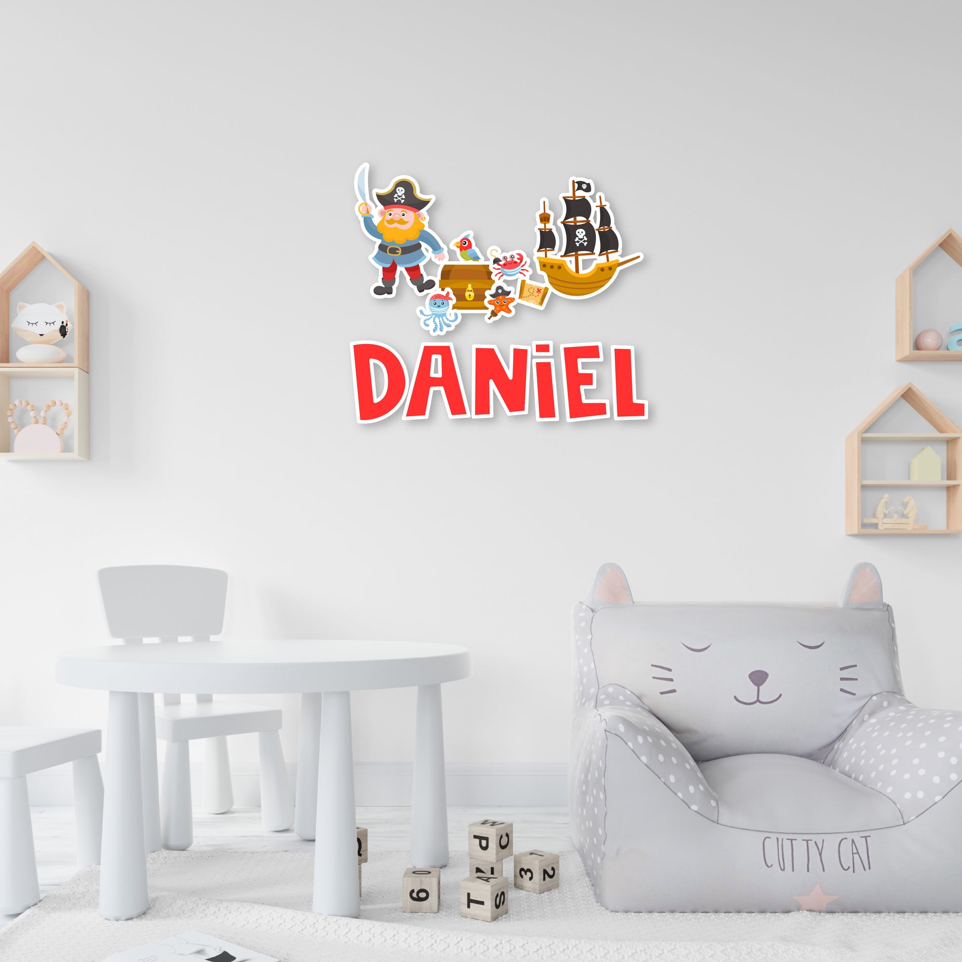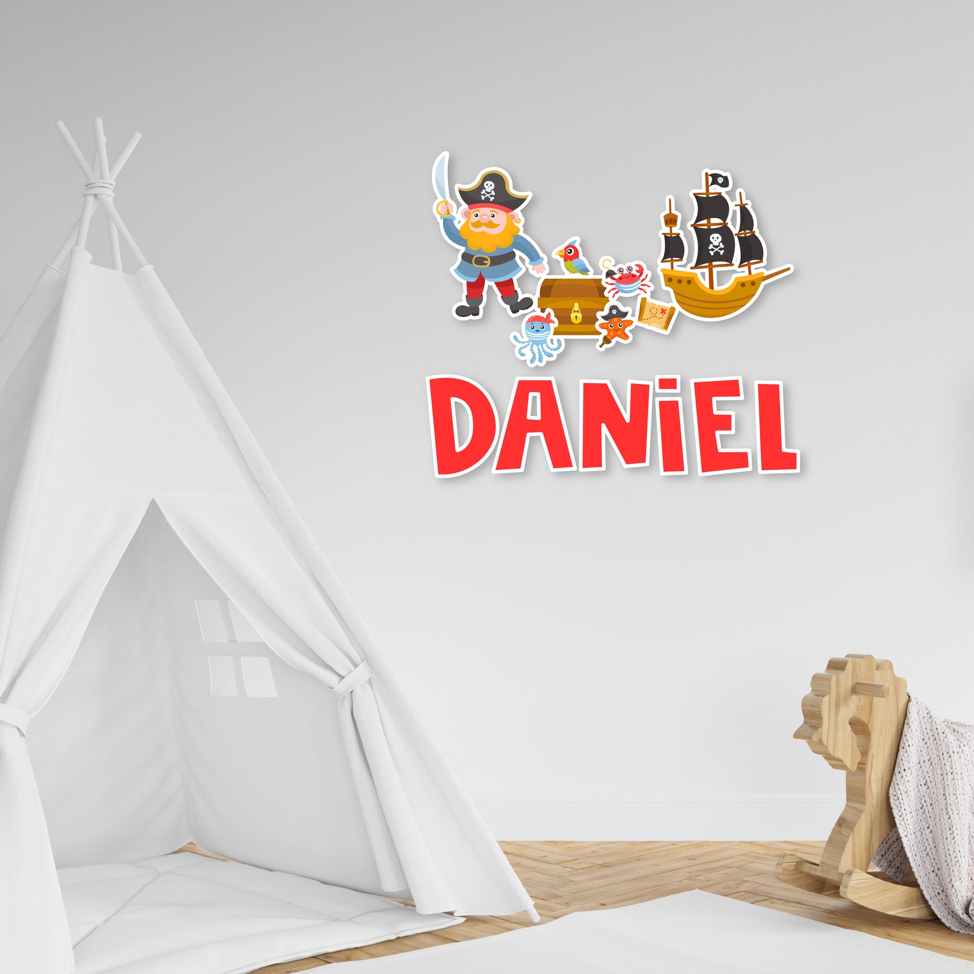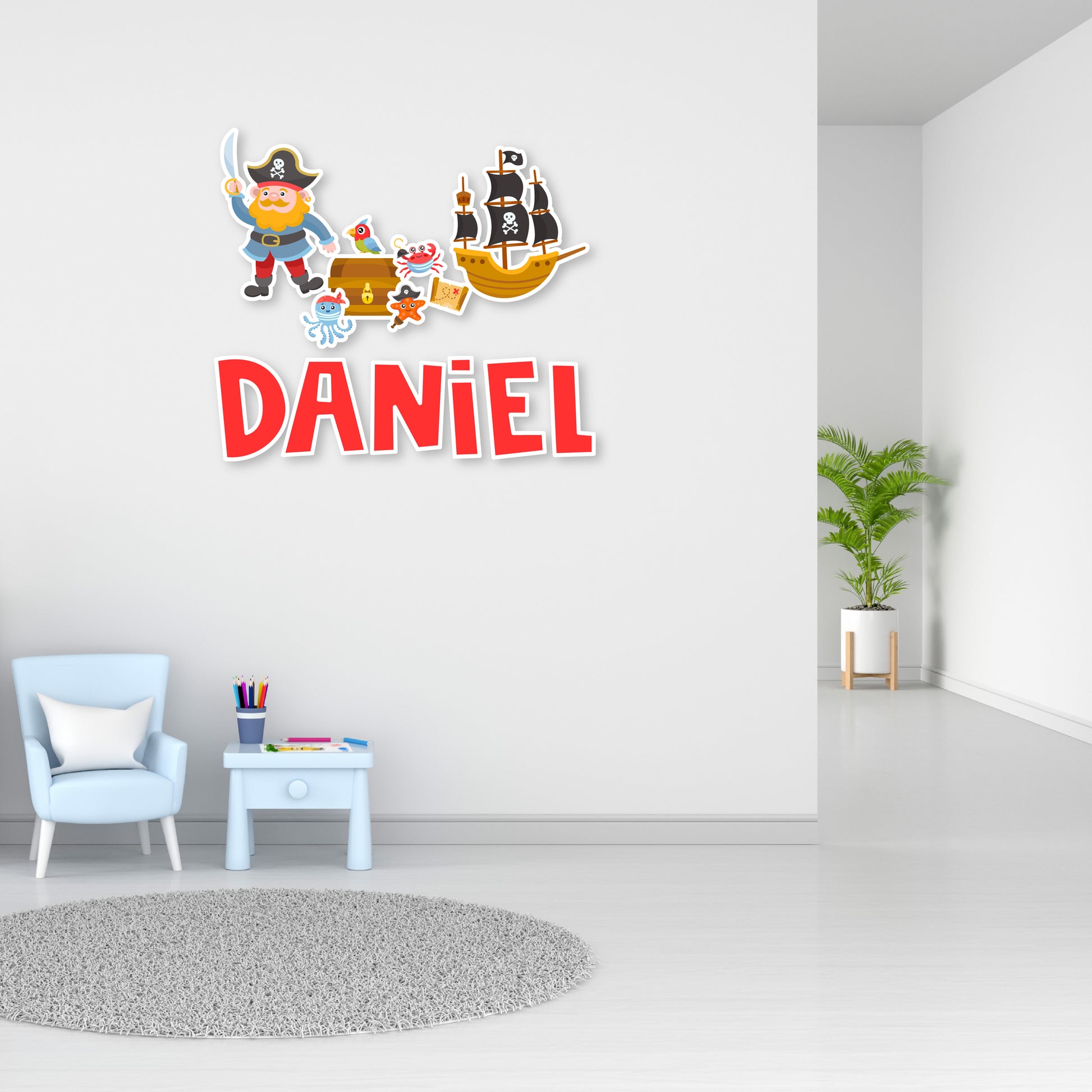 Set sail for treasure-filled adventures with our 'Custom Name Pirate's Treasure' wall decal collection. Your name is surrounded by pirate-themed elements, including a pirate, treasure chest, ship, map, and animals dressed as pirates. Personalize your space with this whimsical pirate design.