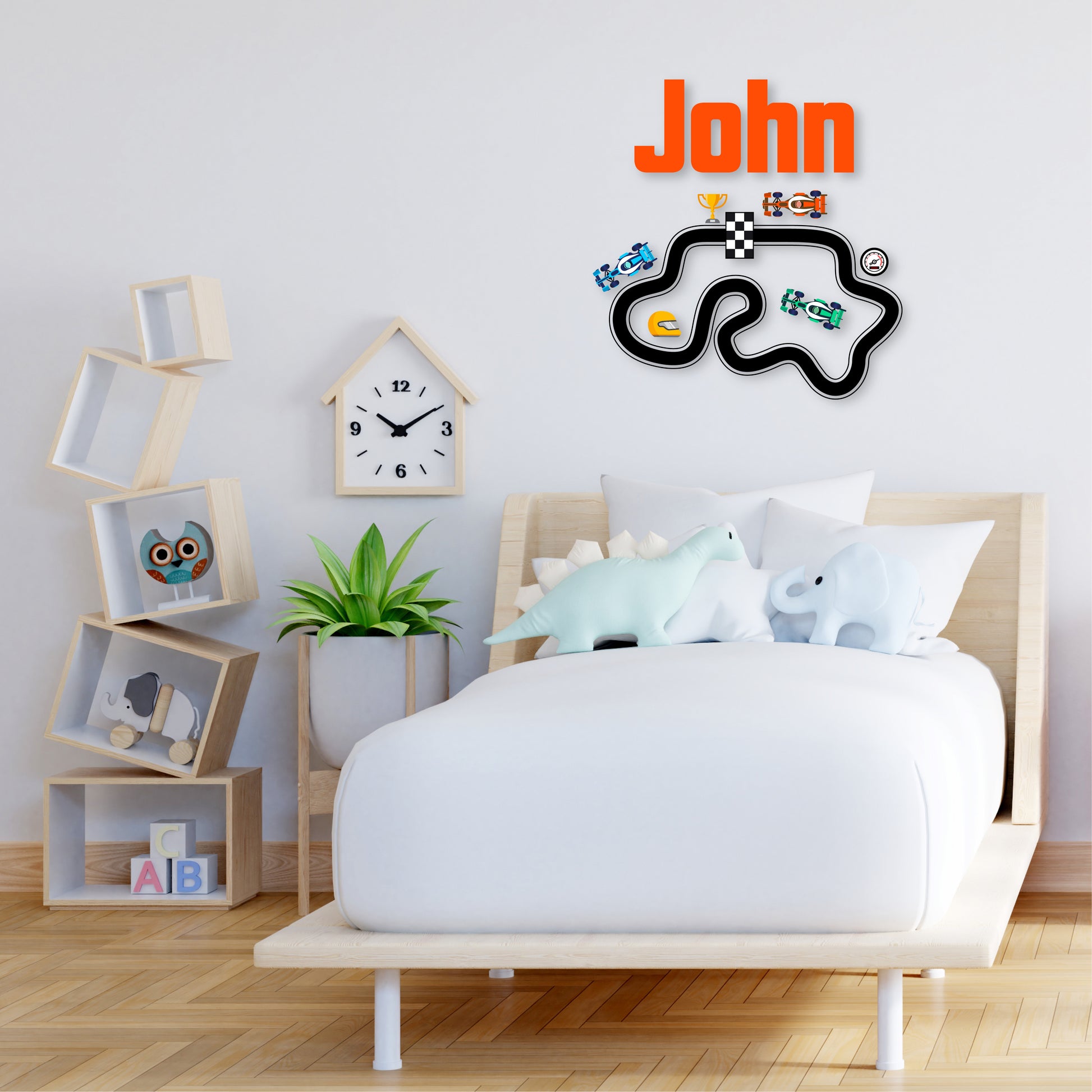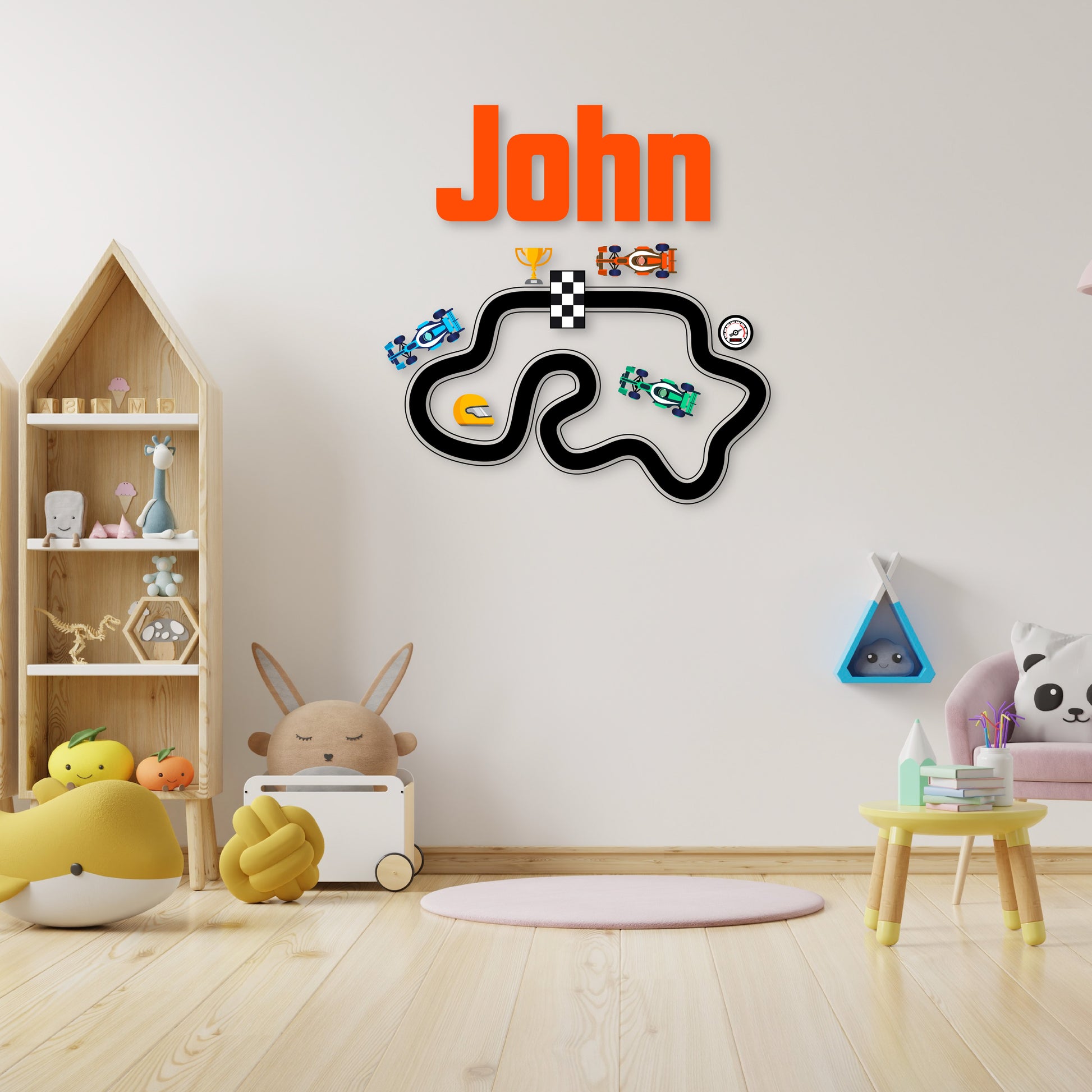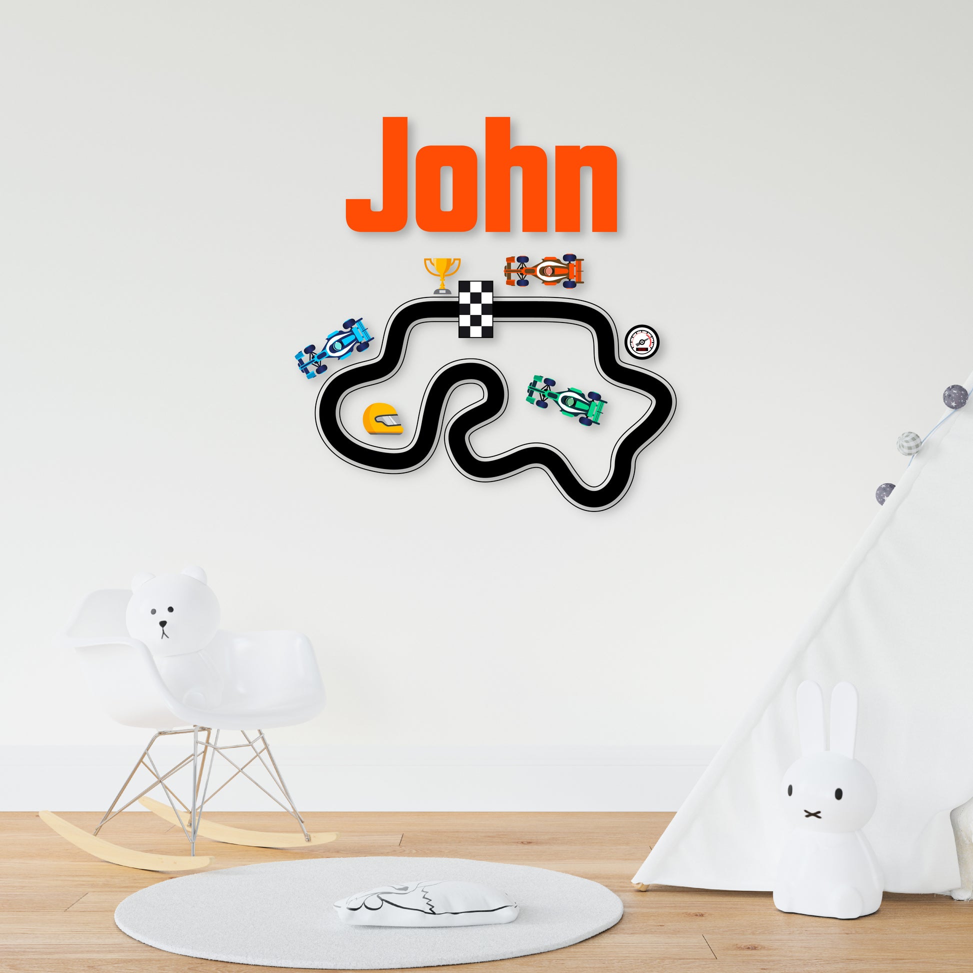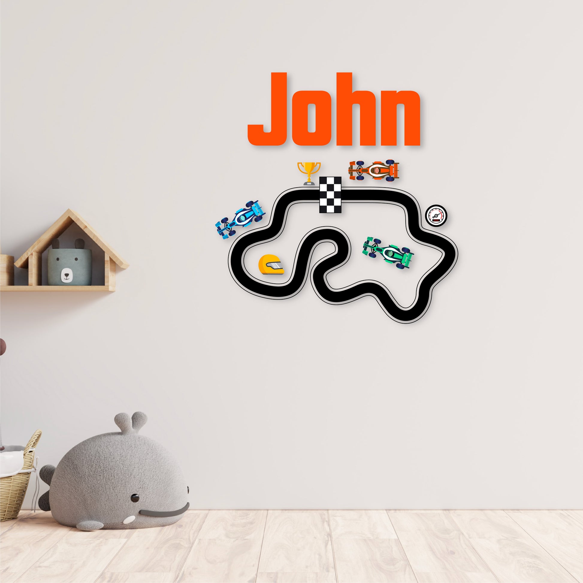 Race to victory with our 'Custom Name Raceway Champion' wall decal collection. Your name takes center stage alongside raceway essentials like a track, trophy, helmet, speedometer, and monoplane cars in green, blue, and orange. Personalize your walls with this dynamic design and celebrate the thrill of the race.