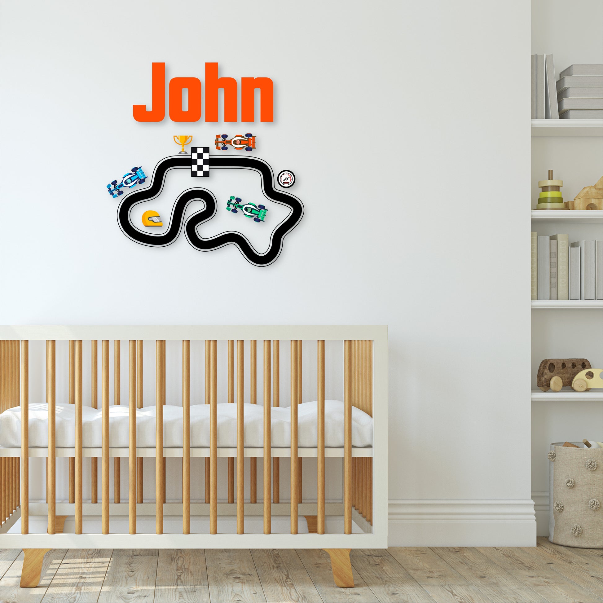 Custom Wall Decals - Custom Name Raceway Champion Wall Decal: Race Track, Trophy, Helmet, Speedometer, Monoplane Cars (Green, Blue, Orange)