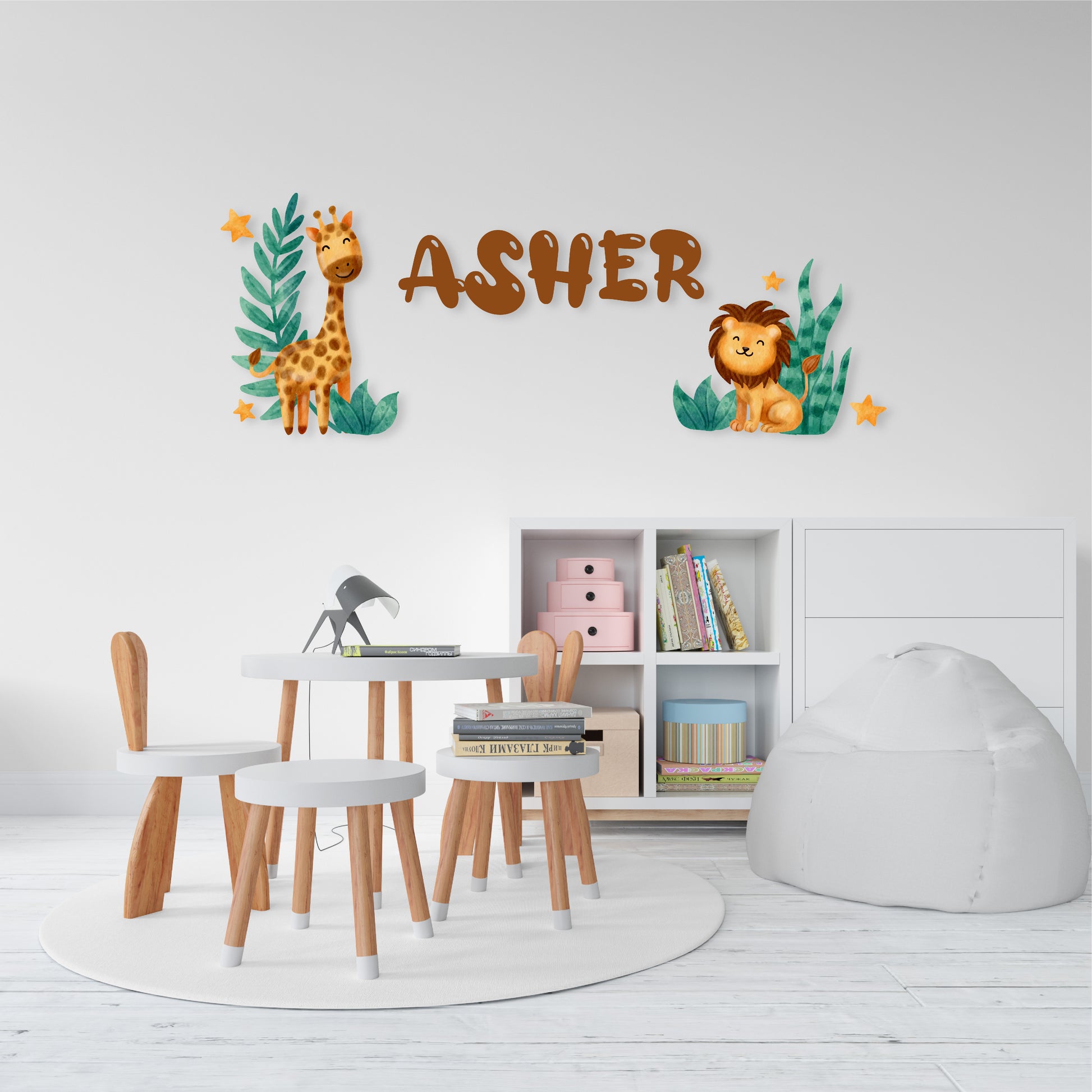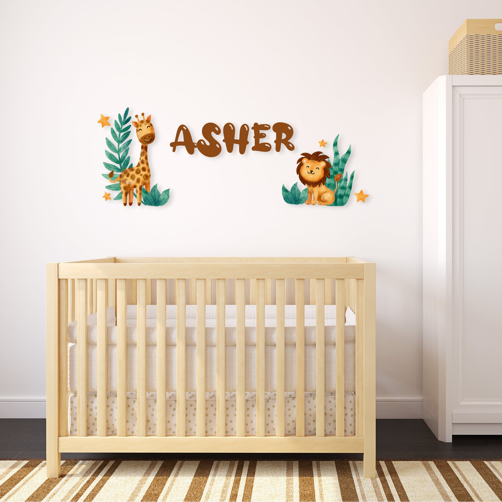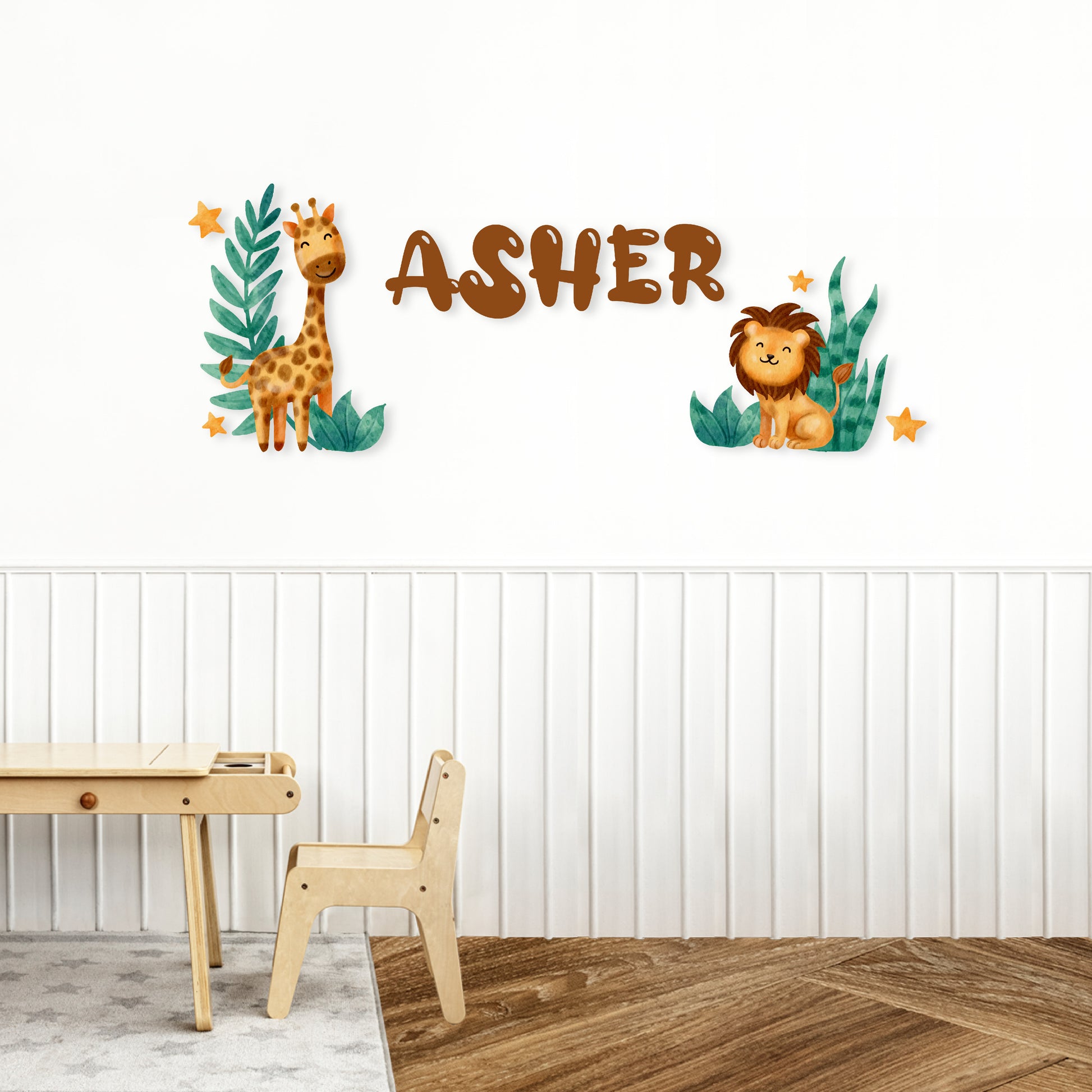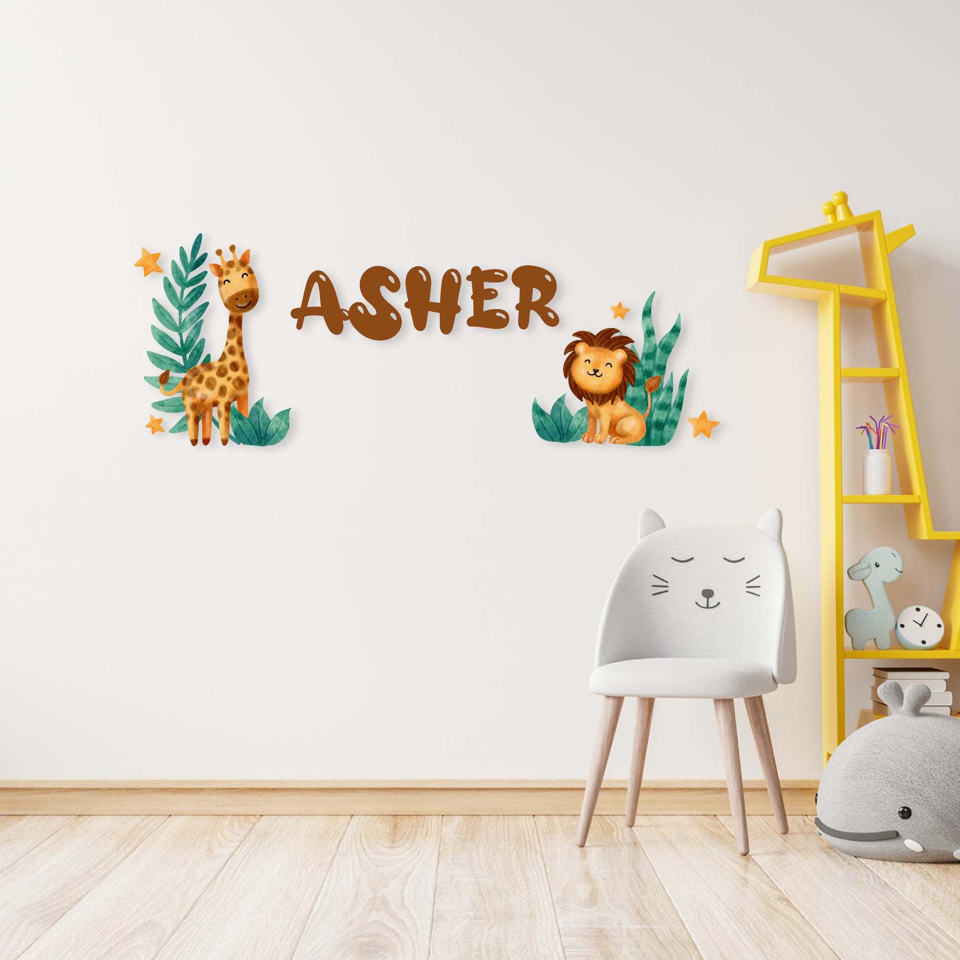 Custom Wall Decals - Custom Name Safari Adventure Wall Decal: Giraffe, Lion, Plants, and Stars