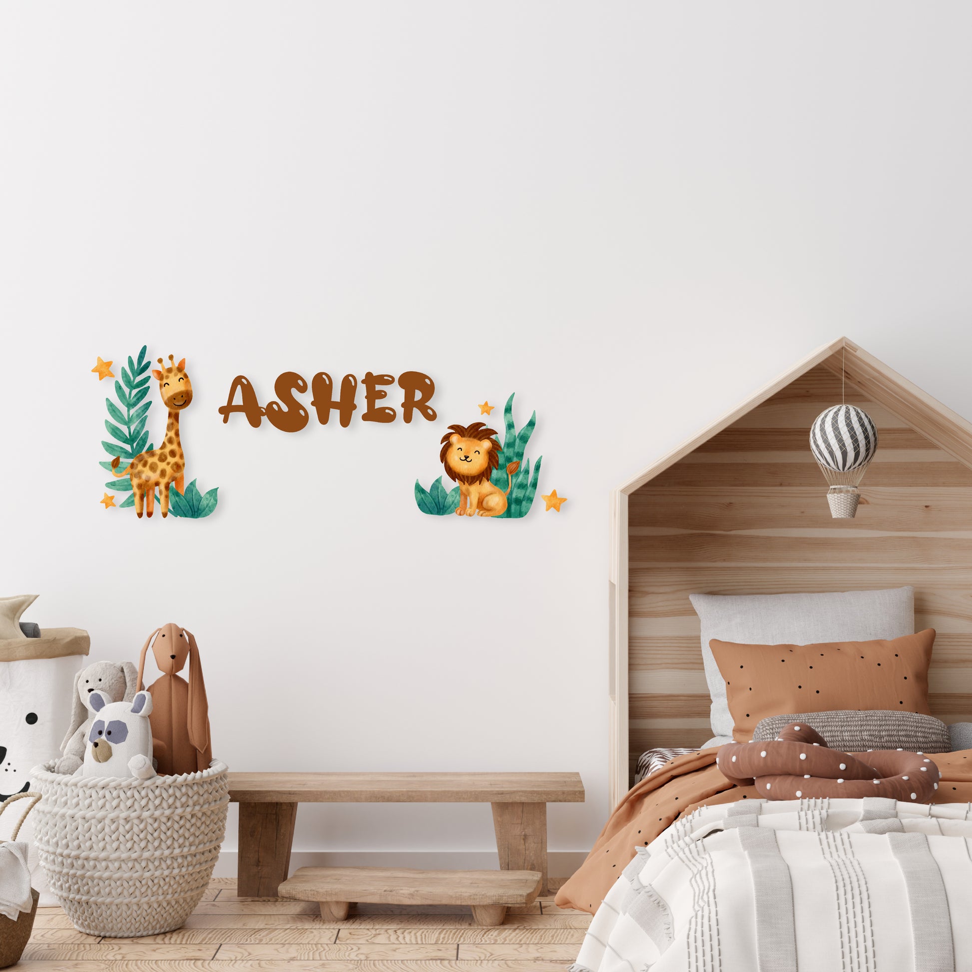 Embark on a wild safari adventure with our 'Custom Name Safari Adventure' wall decal collection. Your name is surrounded by majestic animals like giraffes and lions, amidst lush plants and twinkling stars. Personalize your space with this exotic design and create a safari-inspired haven.