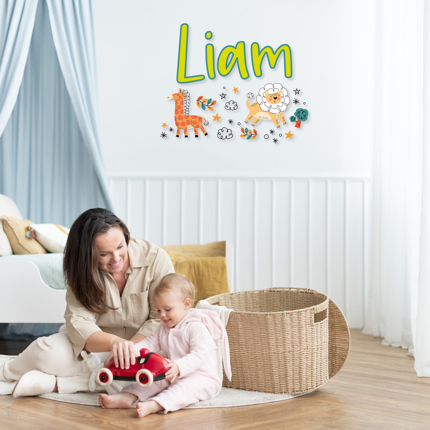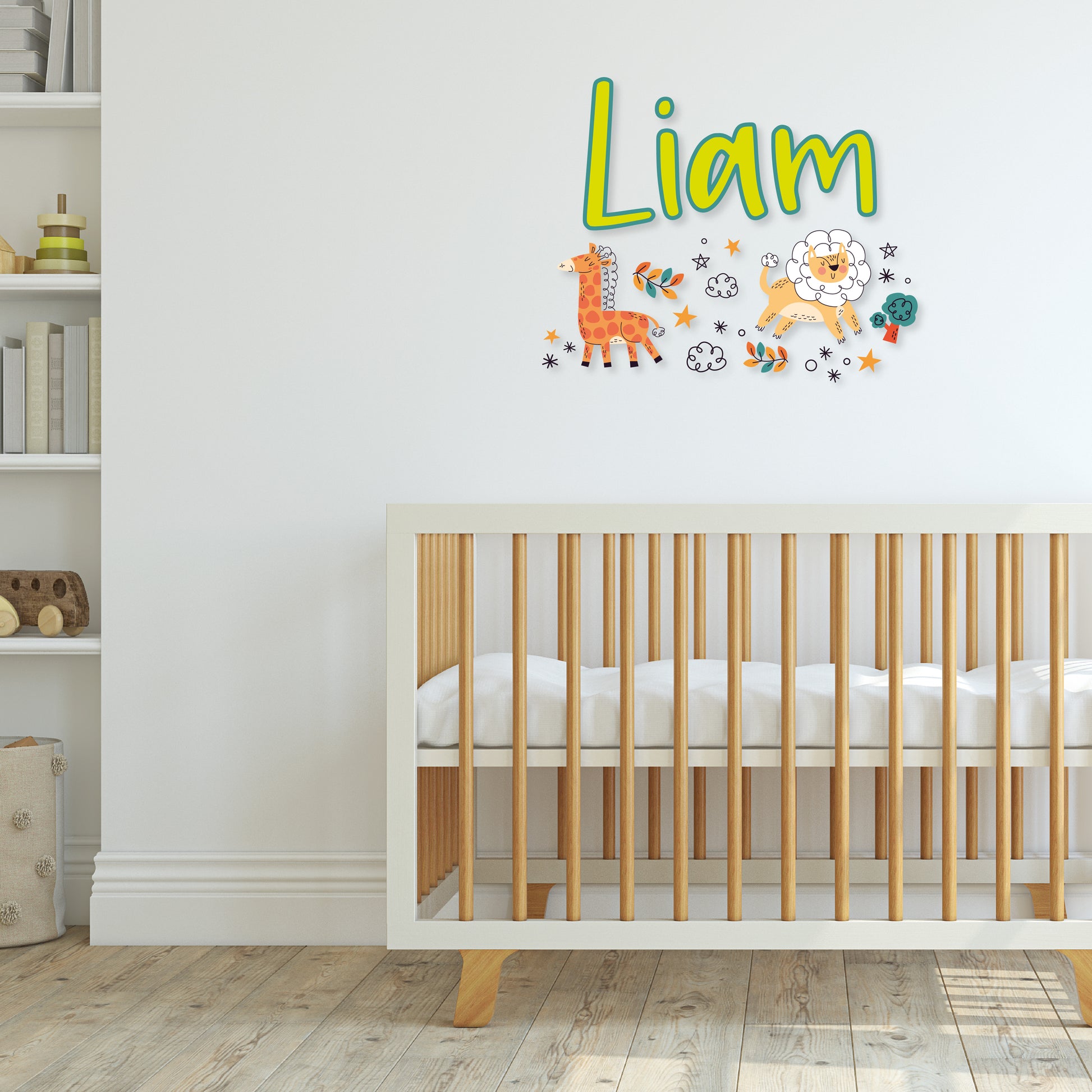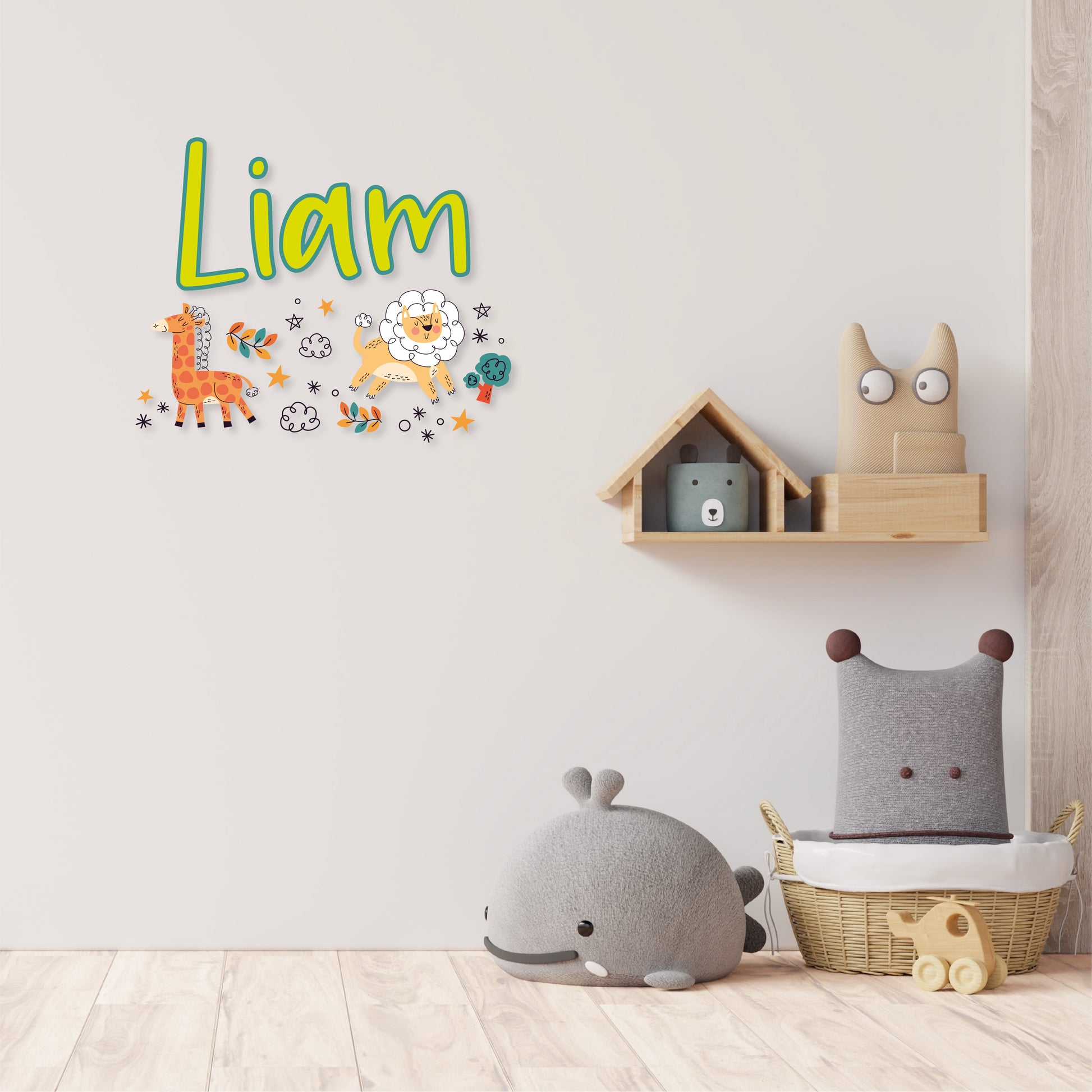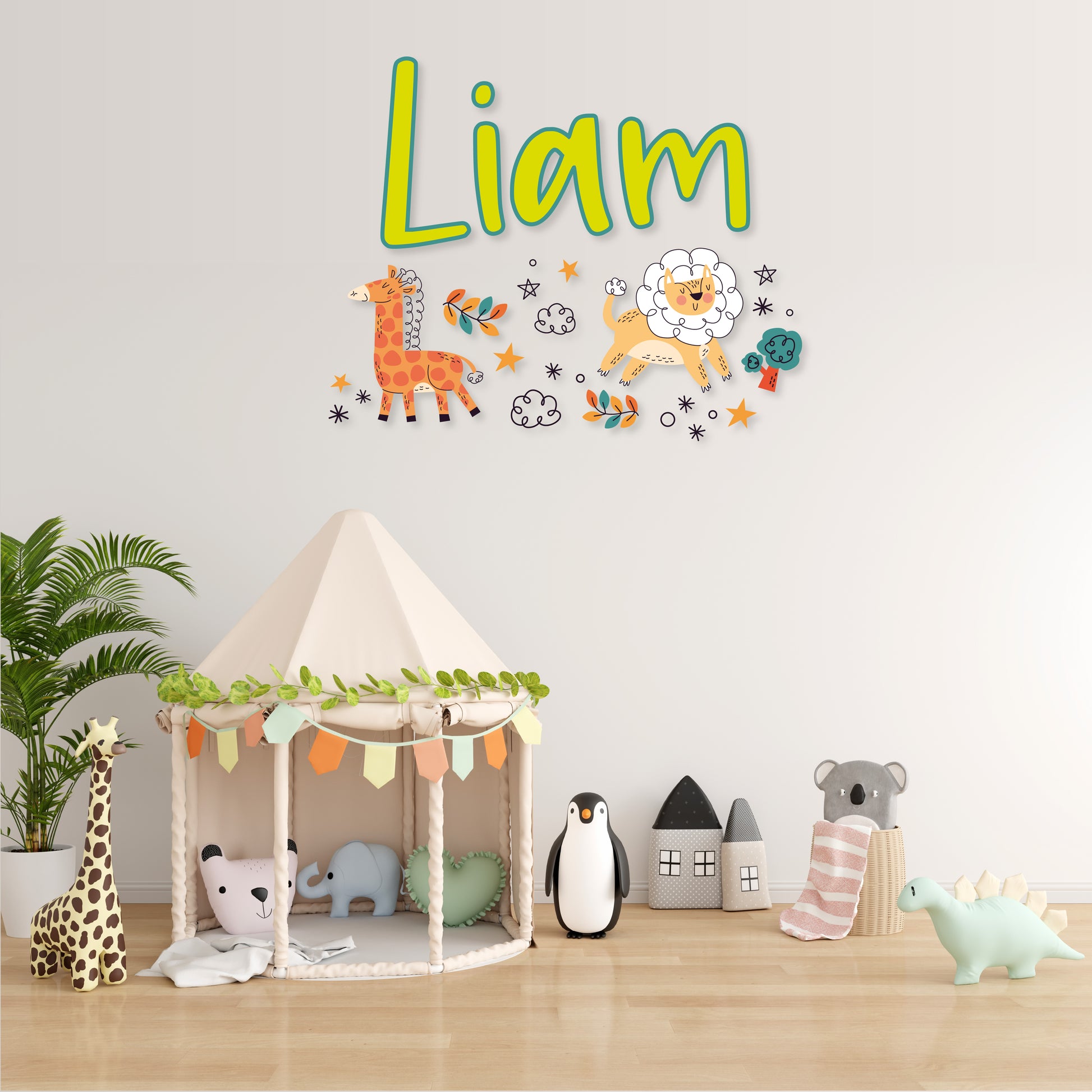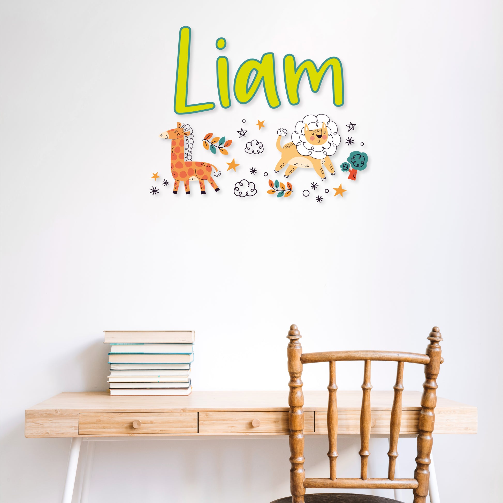 Experience the magic of a safari night with our 'Custom Name Safari Night' wall decal collection. Your name is surrounded by the enchanting presence of a giraffe, lion, plant, stars, clouds, and a tree. Personalize your space with this captivating safari-inspired design and let the nocturnal adventure unfold.