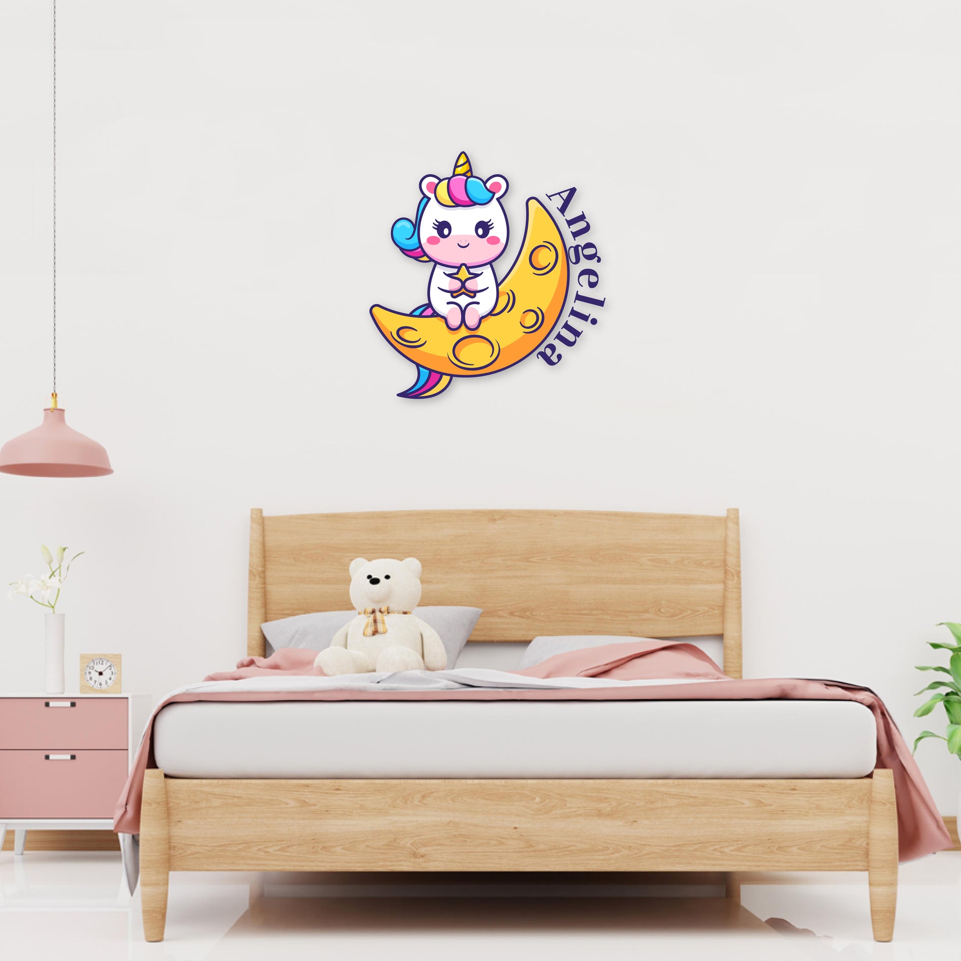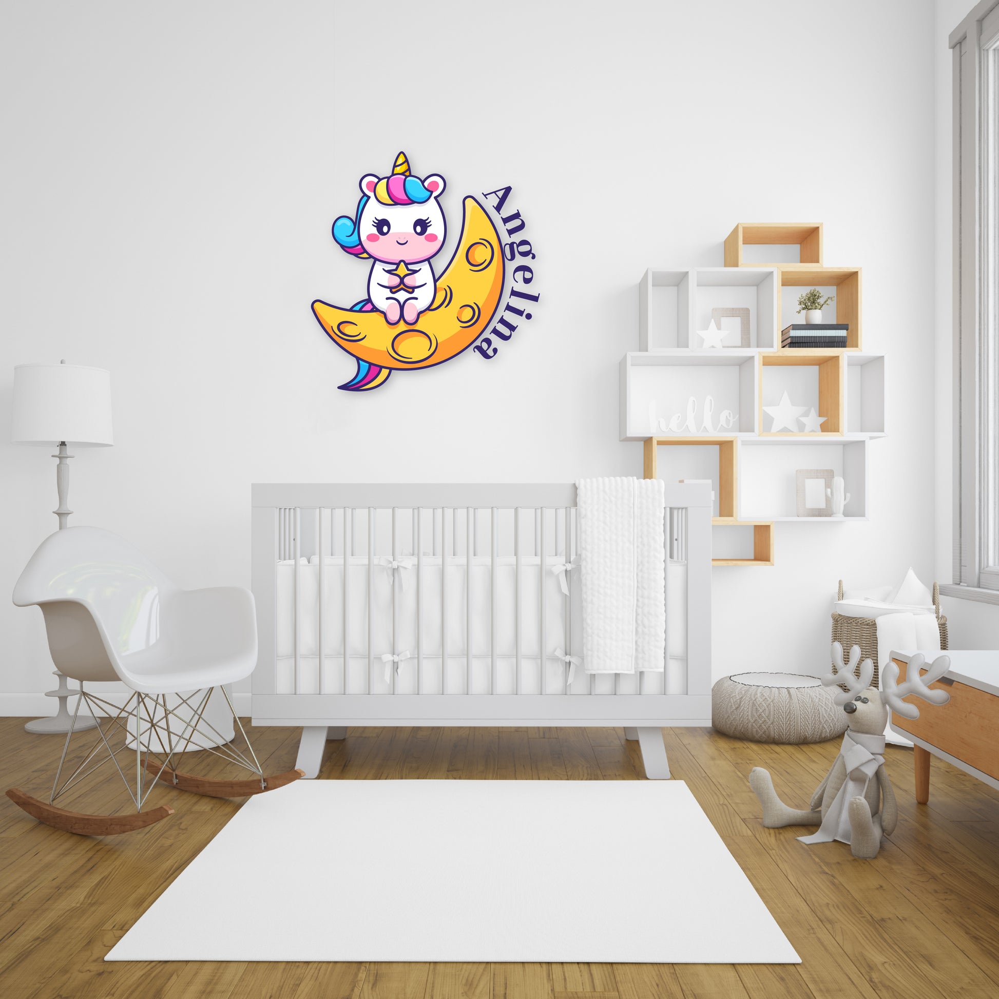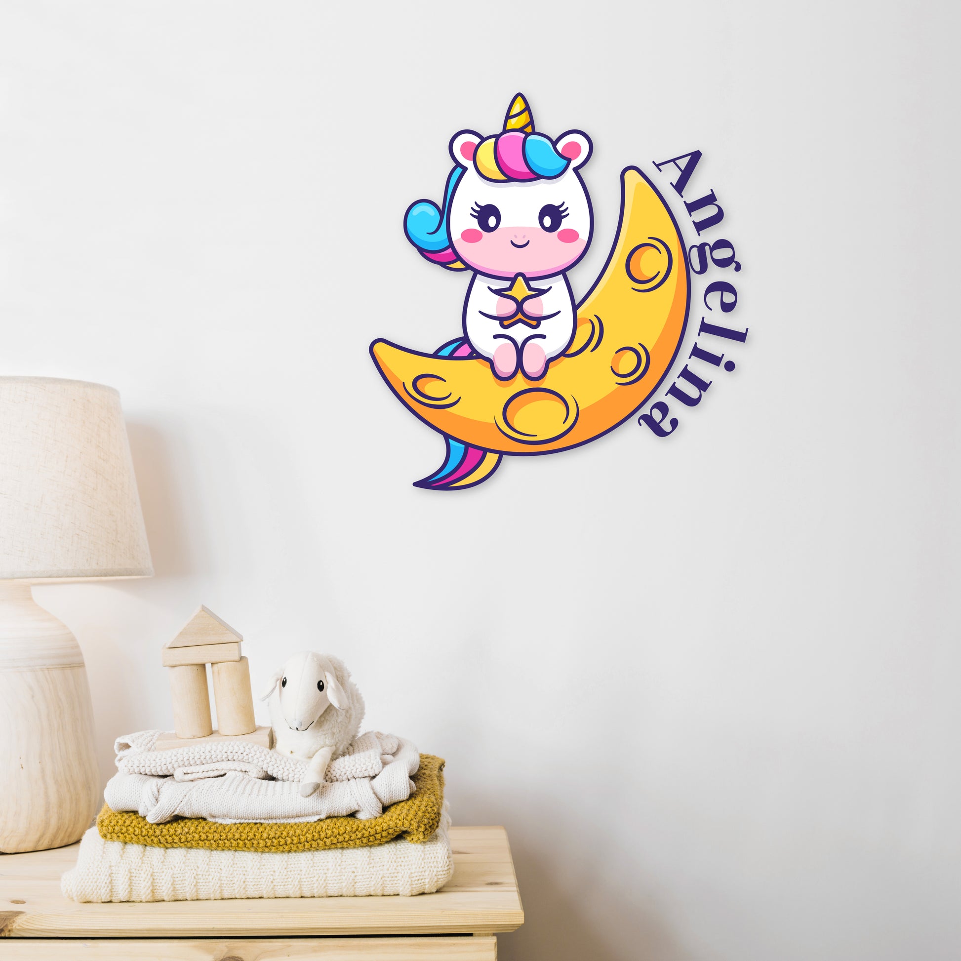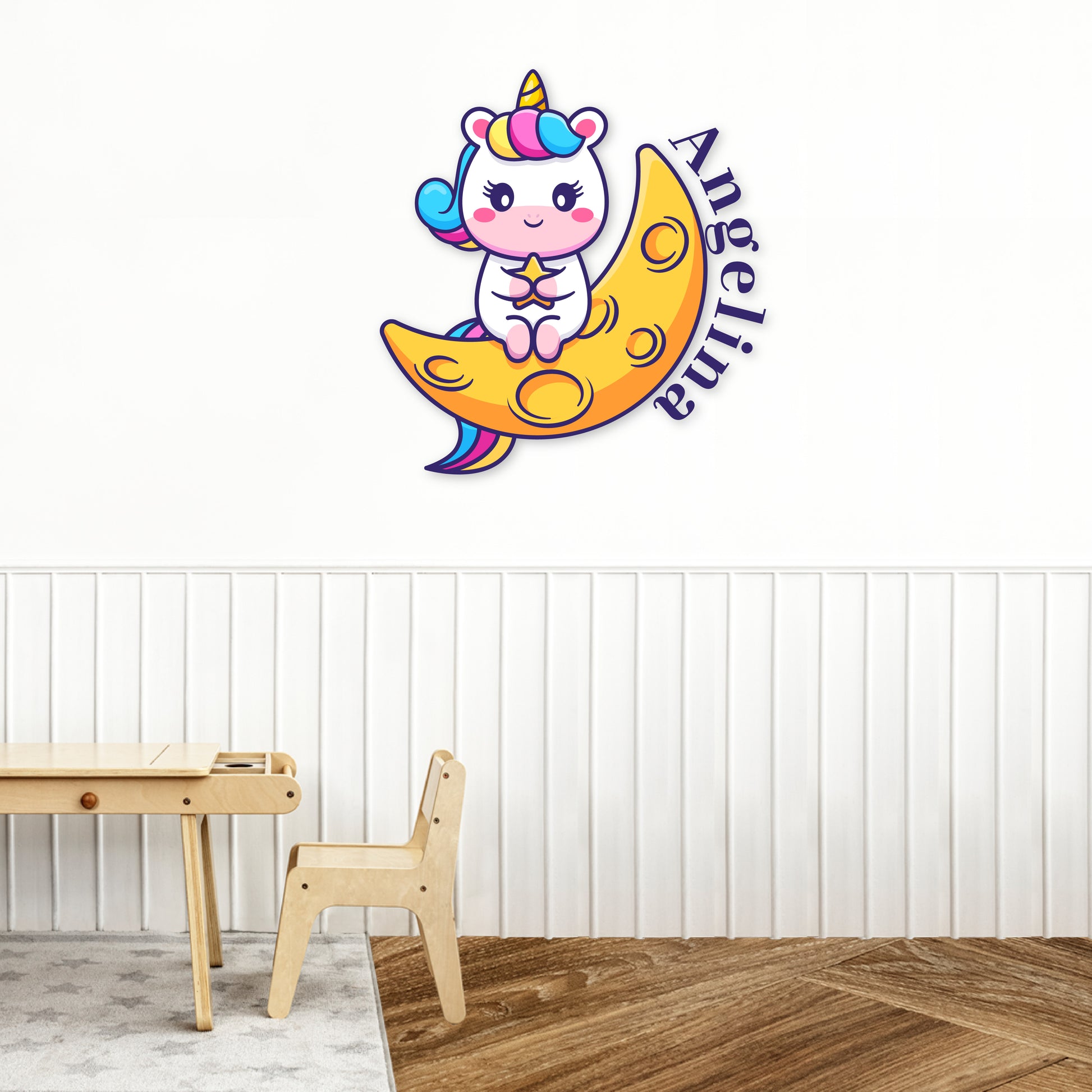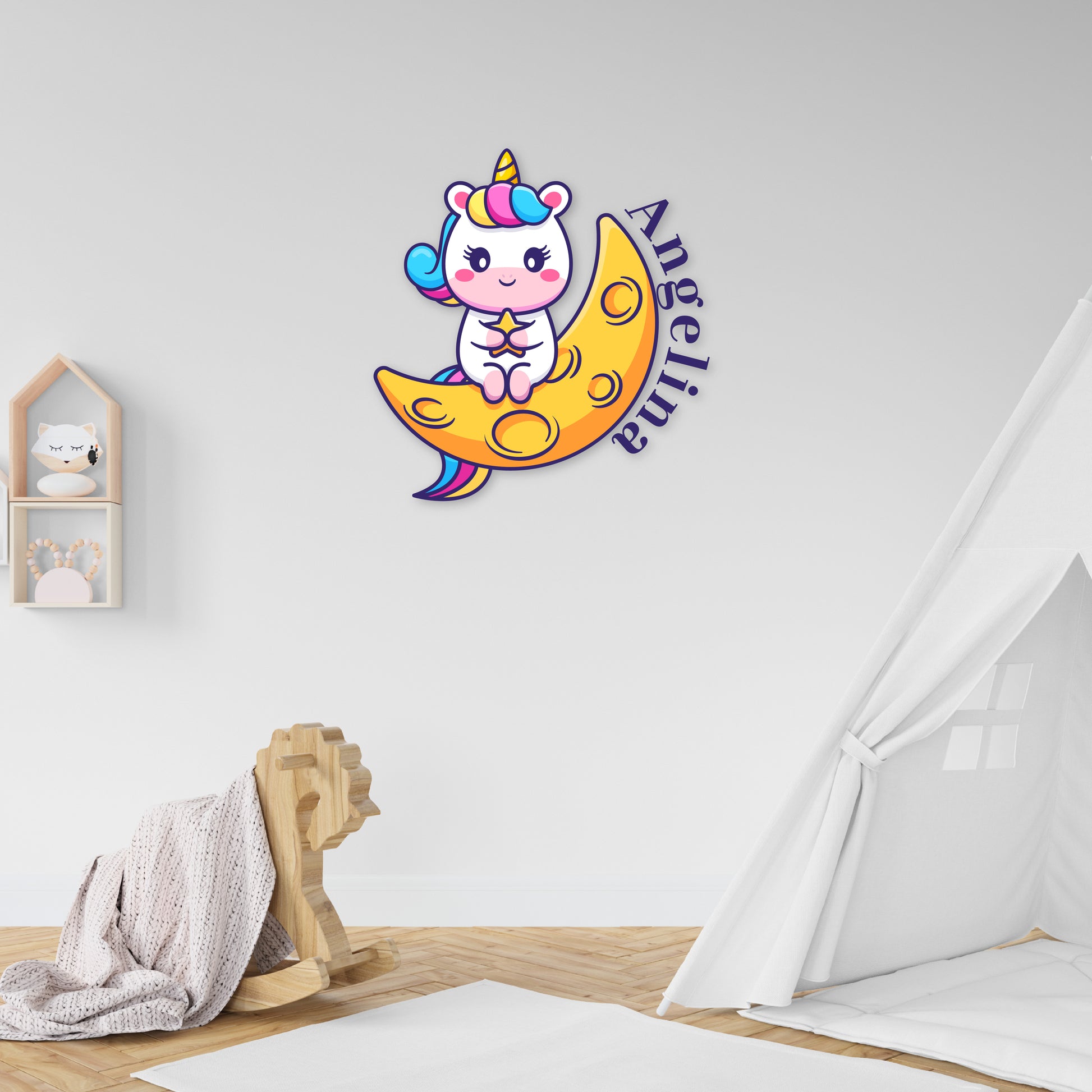 Immerse yourself in a world of whimsy with our 'Custom Name Starry Unicorn Embrace' wall decal collection. Your name is adorned with the magic of a unicorn, embracing a star while seated on a crescent moon. Let this enchanting design fill your space with the beauty of fantasy and create a magical haven that captures the heart.