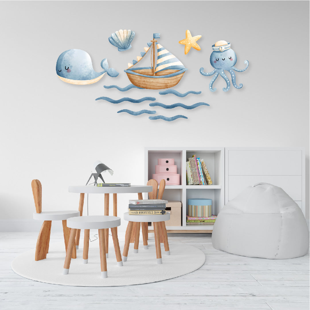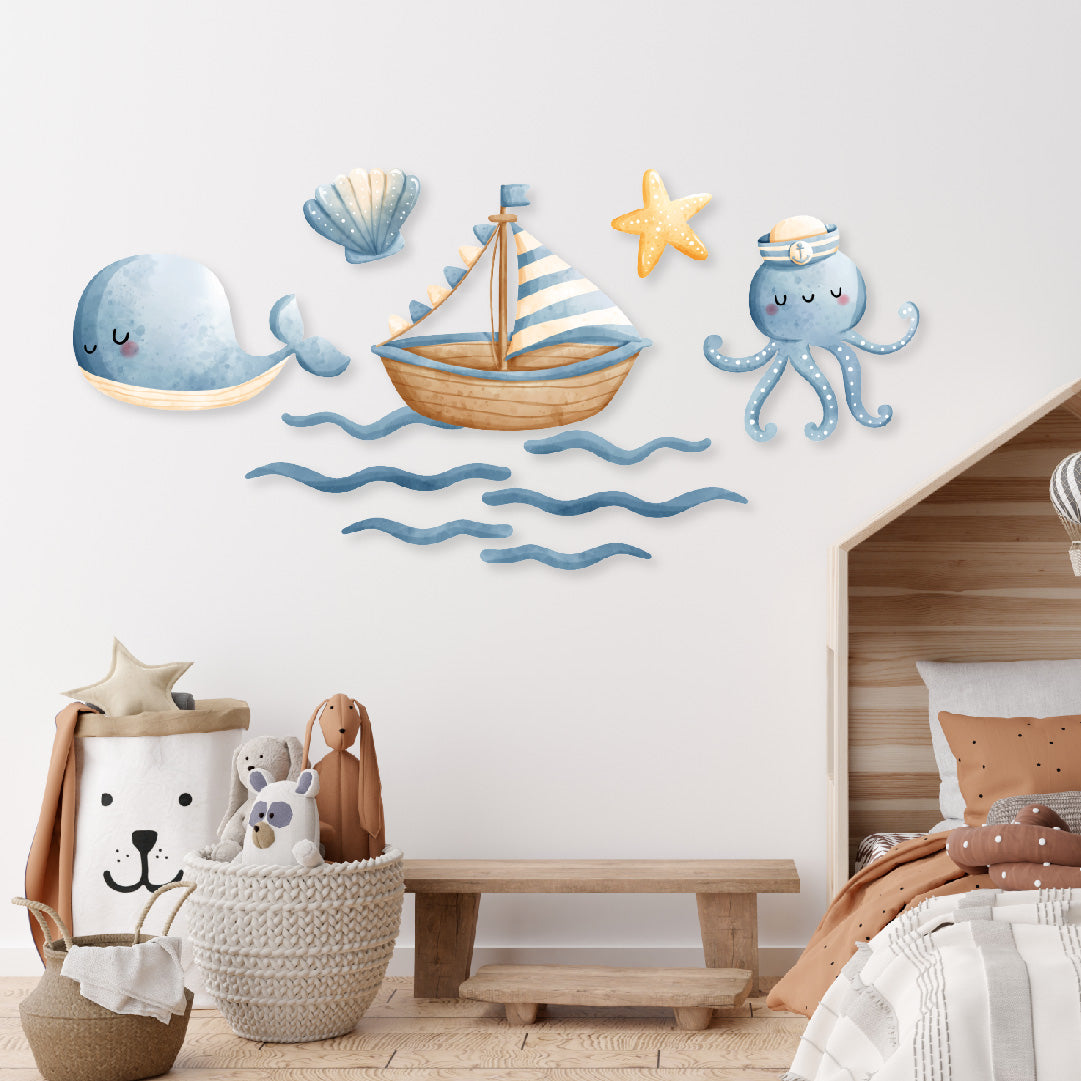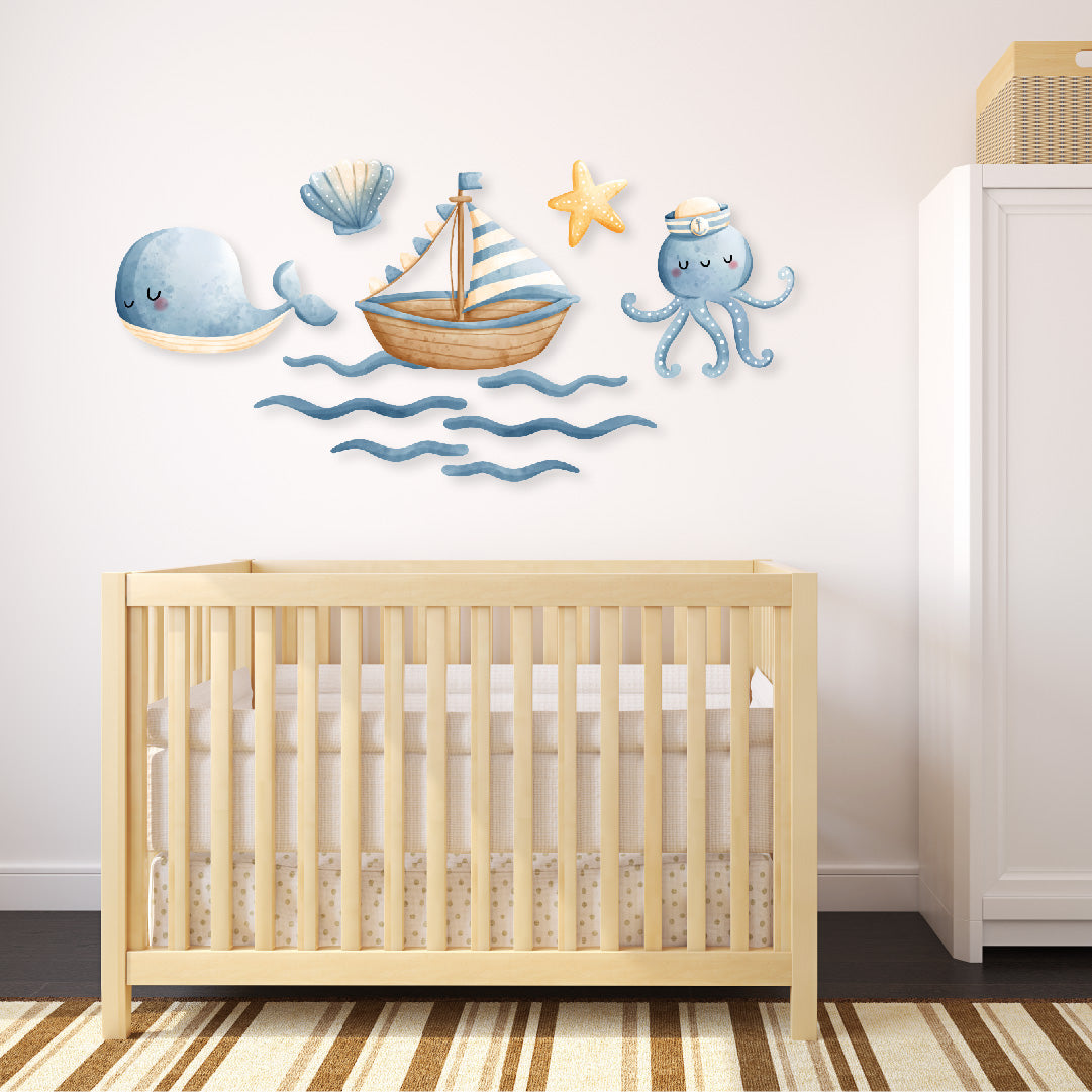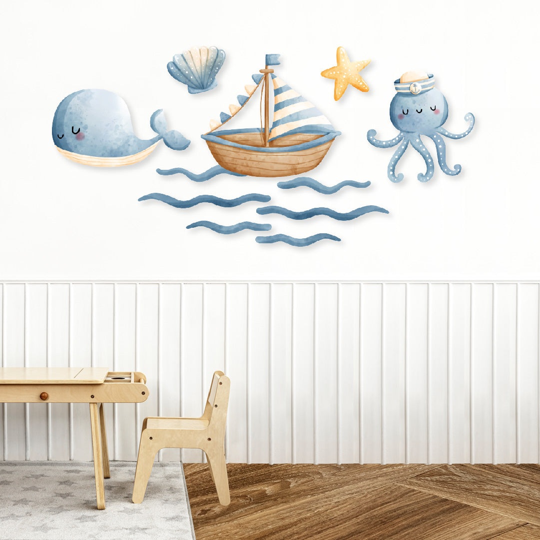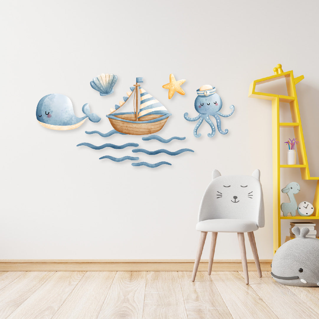 Dive deep into tranquility with our 'Ocean Symphony' decal set. A watercolor masterpiece featuring a boat, whale, seashell, starfish, and octopus, this collection brings the soothing beauty of marine life to your walls. Transform your space into an underwater oasis.